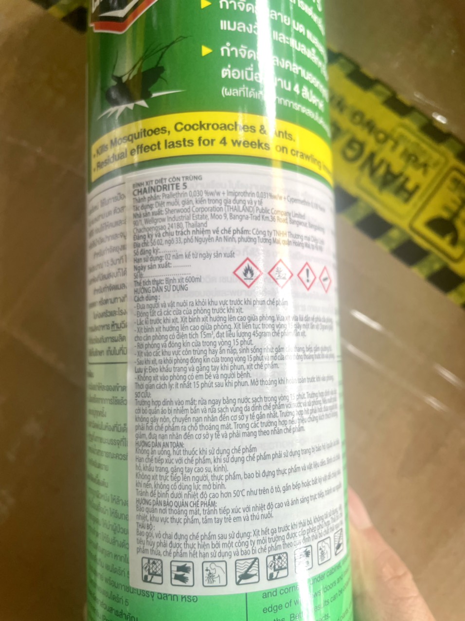 ● Thương hiệu : CHAINDRITE ( THÁI LAN ) ● Nhà sản xuất: Sherwood Corporation ( THÁI LAN ) Public Company Limtied ● Đăng ký và chiệu trách nhiệm về chế phẩm: Công ty TNHH Thương mại Diệp Linh - Việt Nam địa chỉ: Số 02, ngõ 33, phố Nguyễn An Ninh, phường Tương Mai, quận Hoàng Mai, tp Hà Nội ● Dung tích: 600ml ● Phân loại : CHAINDRITE 5 ( diệt muỗi, gián, kiến và côn trùng), CHAINDRITE 3 (chuyên diệt Mối/Mọt/Gián/Kiến/Kiến ba khoang/Côn Trùng ) ● Nổi bật : Bình xịt CHAINDRITE thương hiệu số một tại Thái Lan nên rất An Toàn Cho Người Sử Dụng,Có tác dụng trong 4 tuần kể từ lúc xịt.