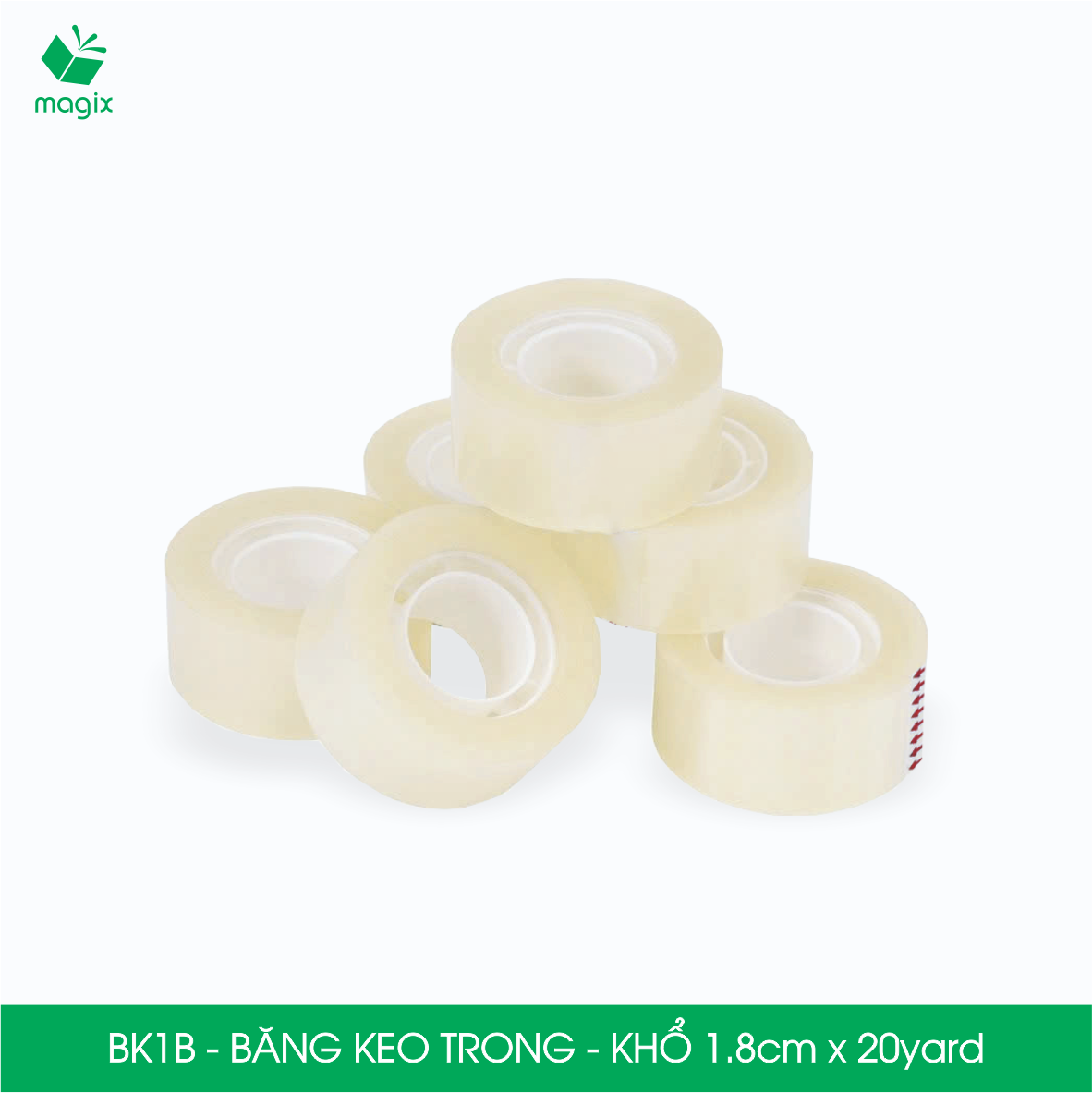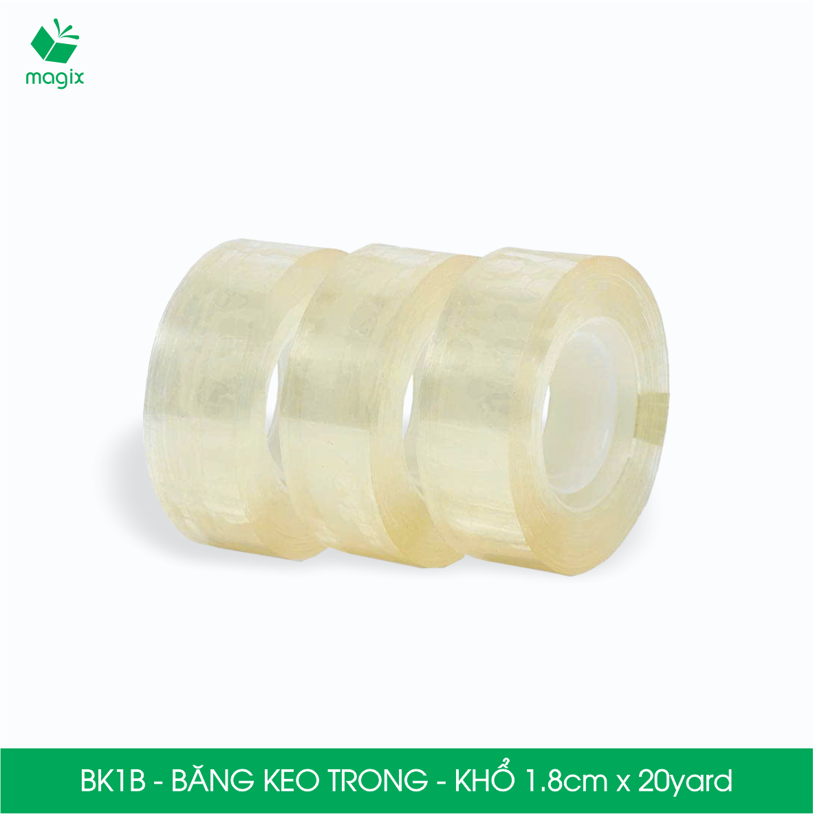 QUY CÁCH KỸ THUẬT Xuất xứ: Việt Nam Màu sắc: Trong suốt Mã sản phẩm - Khổ x Độ dài: • BK1B - 18mm x 20yard - Lõi nhựa • BK1C - 12mm x 100yard - Lõi giấy