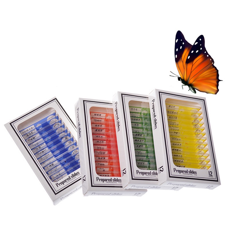 Tính năng: Bộ 12 loại mẫu vật động thực vật Được đóng gói trong một hộp trắng, mỗi mẫu được gắn nhãn với mẫu vật nhận dạng. Các mẫu được kín với một coverslip để