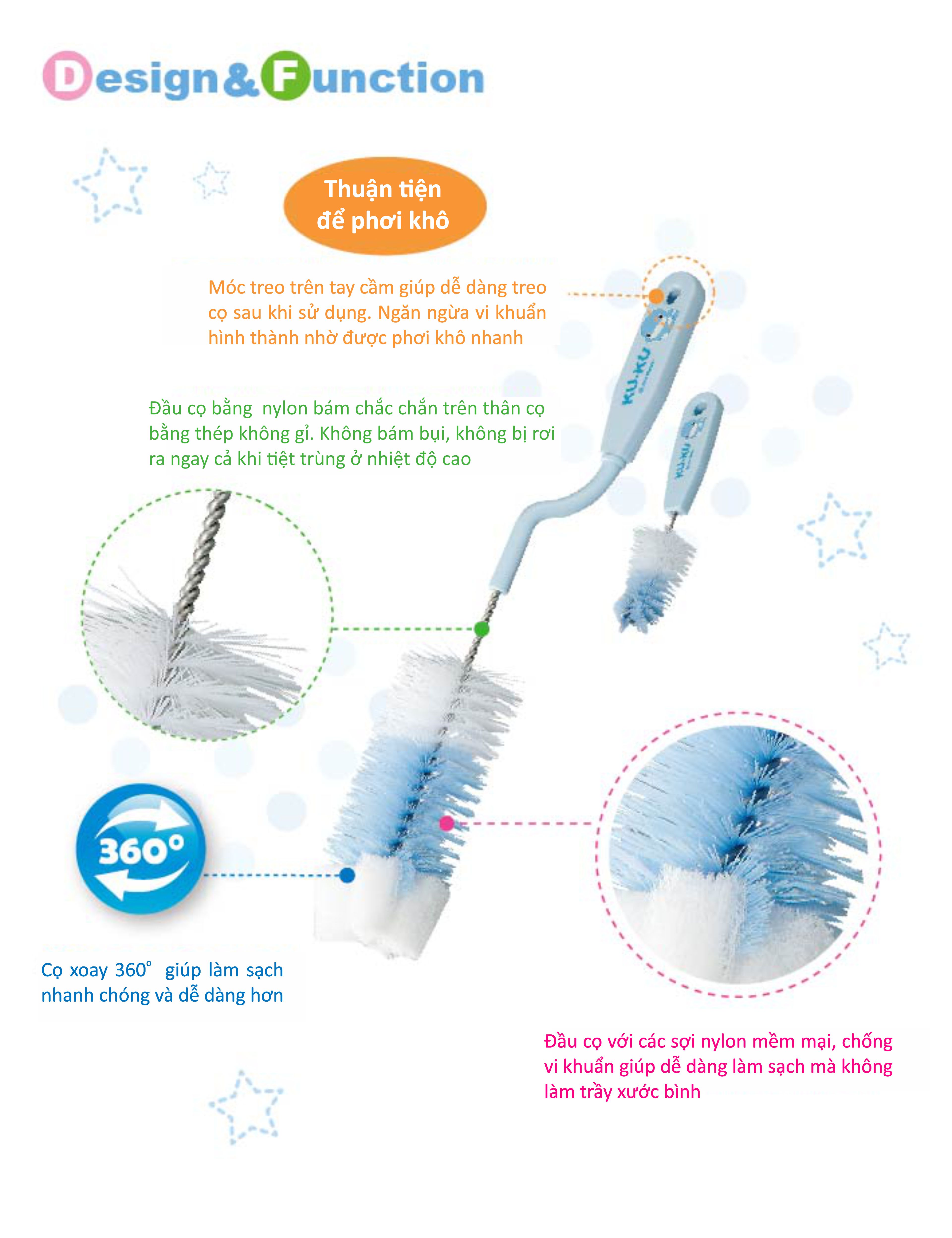 Bộ 2 Cọ Rửa Bình Sữa 360° Kuku KU5480 sẽ giúp bạn làm sạch mọi vết bám bẩn trên bình và phụ kiện bình uống một cách dễ dàng nhờ thiết kế khoa học và tiện