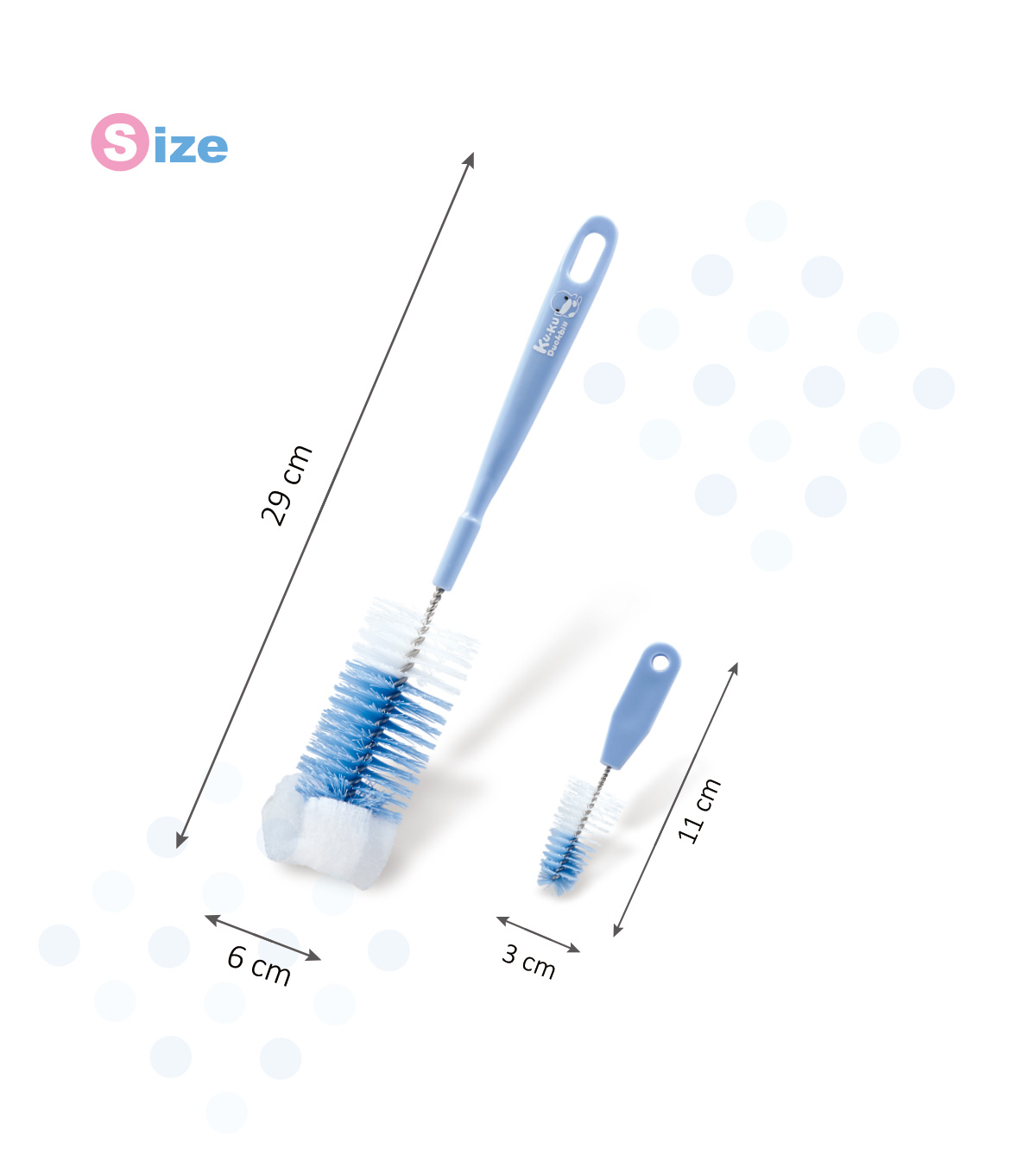 Bộ 2 Cọ Rửa Bình Sữa Kuku KU5302 cung cấp cho bạn 1 cọ lớn và 1 cọ nhỏ tiện lợi hơn cho bạn khi sử dụng. Bạn có thể dùng cọ lớn với tay xoay linh hoạt và đầu cọ xoáy 360 độ dễ dàng giúp rửa sạch mọi vết bám bẩn ở tận bề mặt đáy. Cọ nhỏ hơn dùng khi vệ sinh các loại phụ kiện bình uống.