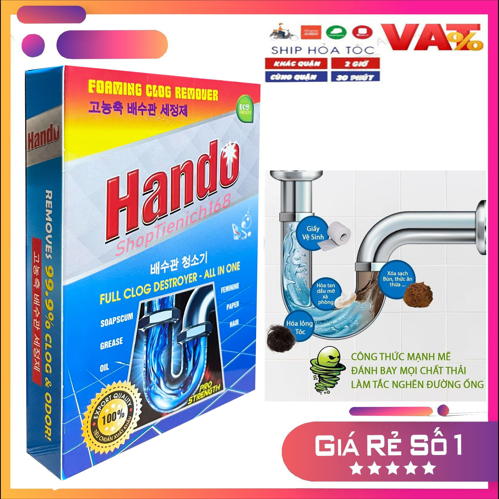 - Bột thông cống xuất khẩu Hando 100Gr với công thức tiên tiến, các thành phần hóa học chuyên dụng, độ tẩy cực mạnh sẽ xoáy tan mọi cặn bẩn trong đường ống một cách hiệu quả.