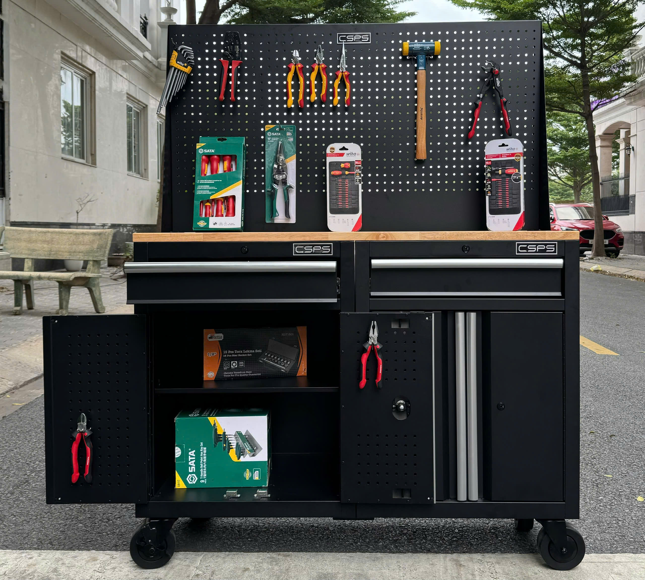 ✨Bộ 2 Tủ dụng cụ CSPS 122cm màu đen mặt ván gỗ kèm vách lưới - 02 hộc kéo (tay cầm trắng)
