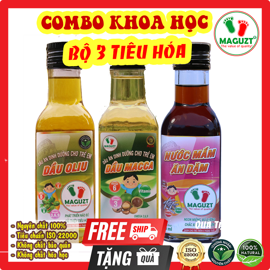 - Dầu Macca cho bé ăn dặm Maguzt Nguyên chất ( Có thể thay thế bằng dầu Mè đen hoặc dầu hạt chia) Công dụng cụ thể của bộ 3 dầu ăn dặm hỗ trợ tiêu hóa cho bé. Hỗ trợ phát triển miễn dịch hệ tiêu hóa kịp thời Hướng dẫn sử dụng dầu ăn dặm hỗ trợ tiêu hóa cho bé hiệu quả nhất: Dùng dầu Oliu vào buổi ăn trưa cho bé. Dùng dầu Macca cho buổi chiều. Kết hợp nước mắm thơm ngon vào mỗi bữa ăn.