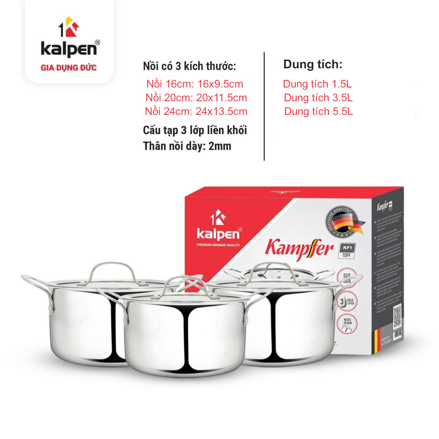 Bộ 3 nồi inox 3 lớp liền khối Kalpen Kampfer KF1 size 16/20/24cm bảo hành 30 năm