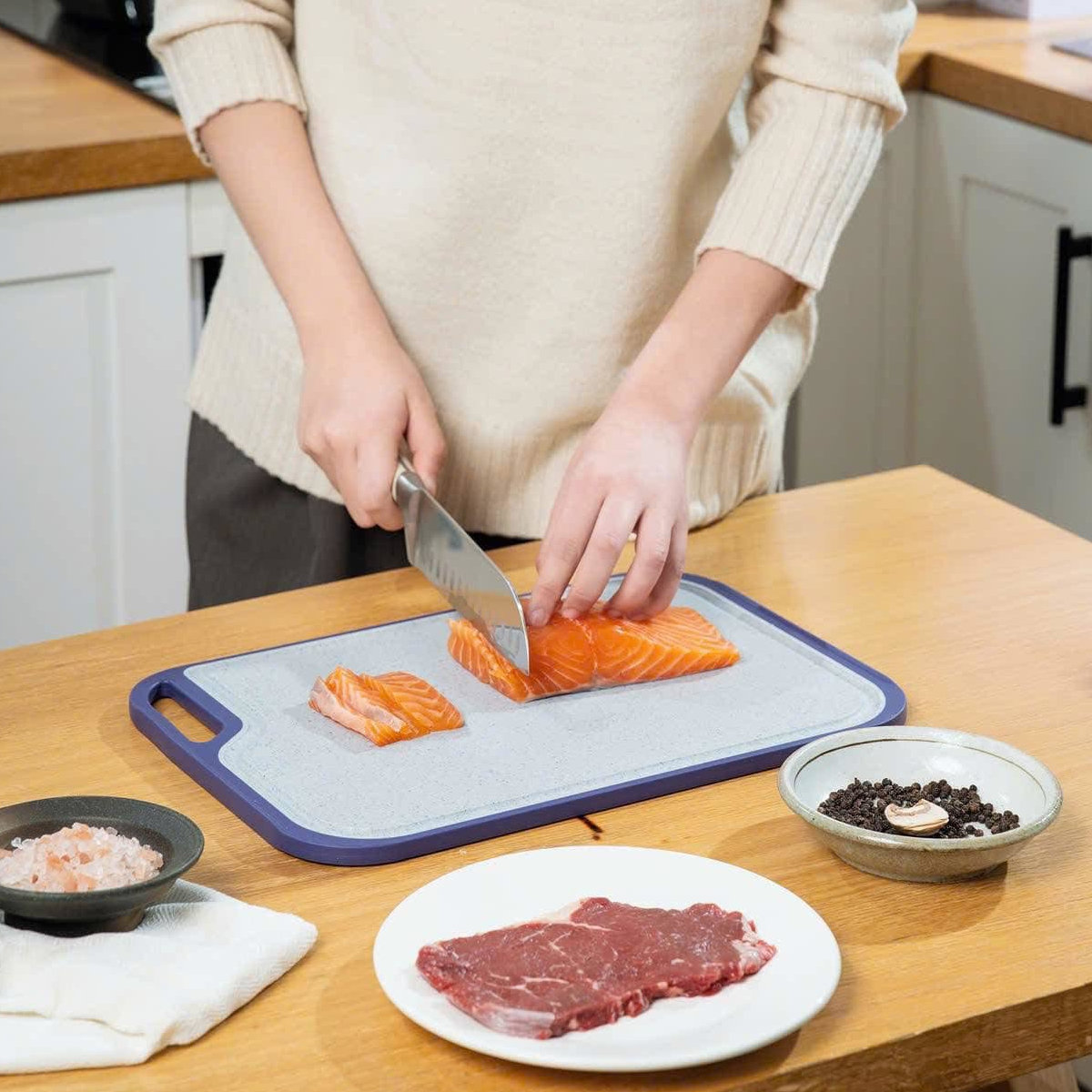 - Phân chia sử dụng thớt theo từng loại thực phẩm để tối ưu hiệu quả chống nhiễm khuẩn.