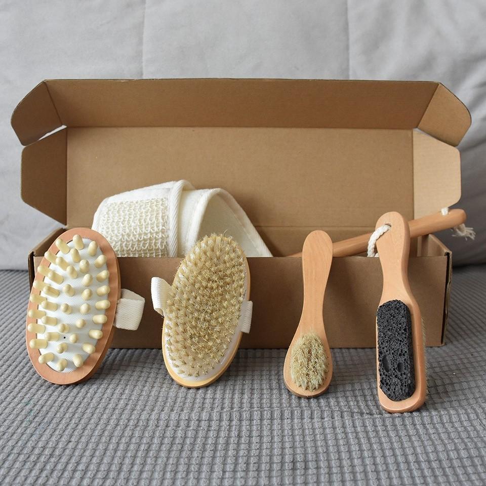 Bộ sản phẩm bao gồm 5 món bàn chải tắm đa năng, được sản xuất tại Việt Nam từ gỗ tự nhiên loại tốt.