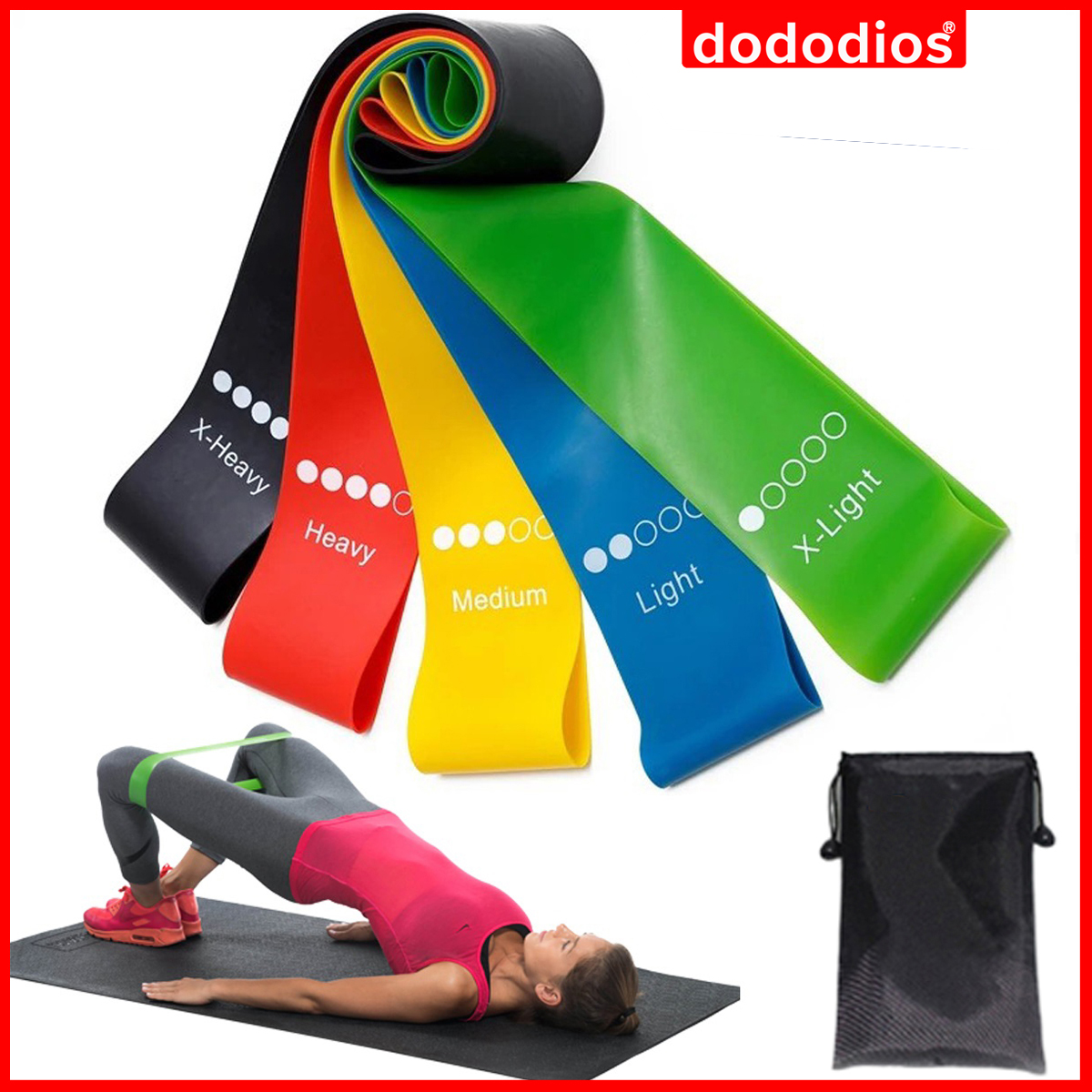 Bộ 5 Dây Đàn Hồi - 5 Dây Kháng Lực Tập Gym Tập Yoga Tập Thể Thao Cao Su Non Cao Cấp Chính Hãng dododios - Có Túi Đựng Cao Cấp Hướng Dẫn Sử Dụng