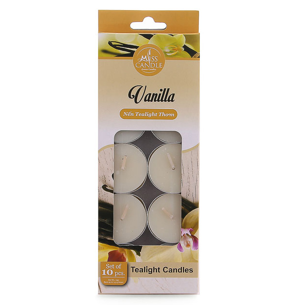 Mỗi hộp chứa 10 nến tiện lợi và tiết kiệm. Kích thước mỗi viên: đường kính (D) x chiều cao (H): 4 x 1 cm, thời gian cháy 3h30 – 4h. Sử dụng nguyên liệu