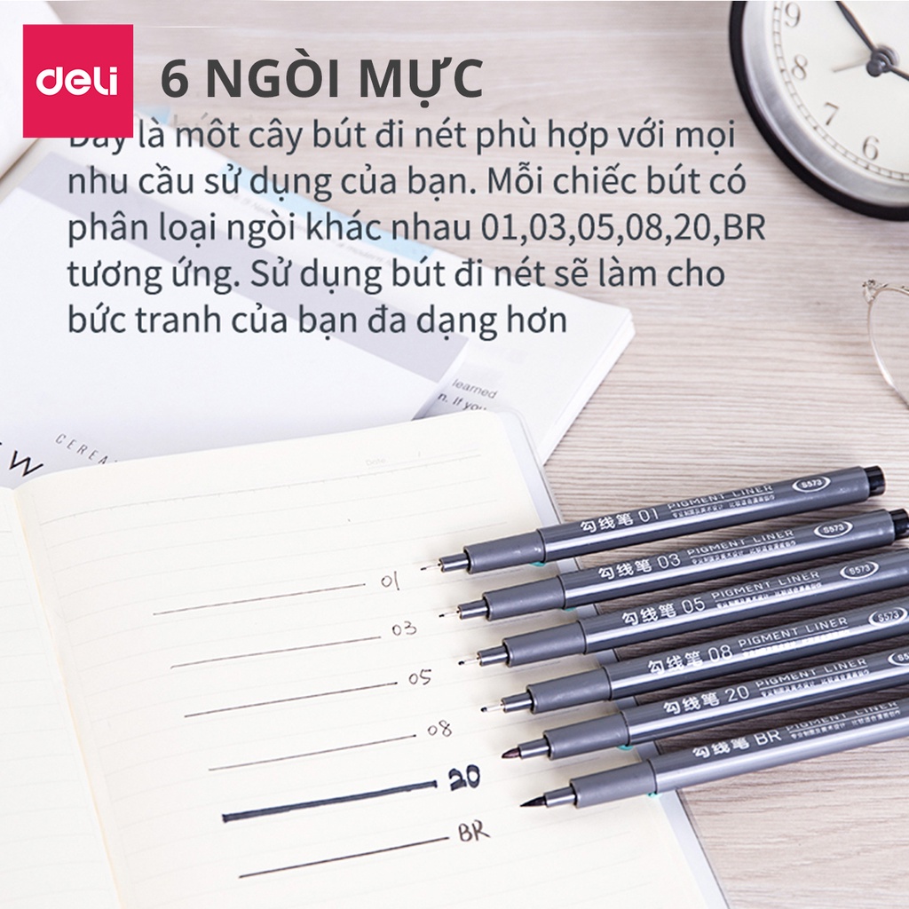 ✨Bộ 6 cây Bút đi nét - Bút vẽ kỹ thuật mực đe - vẽ caligraphy phác thảo mực đen kháng nước Deli S573