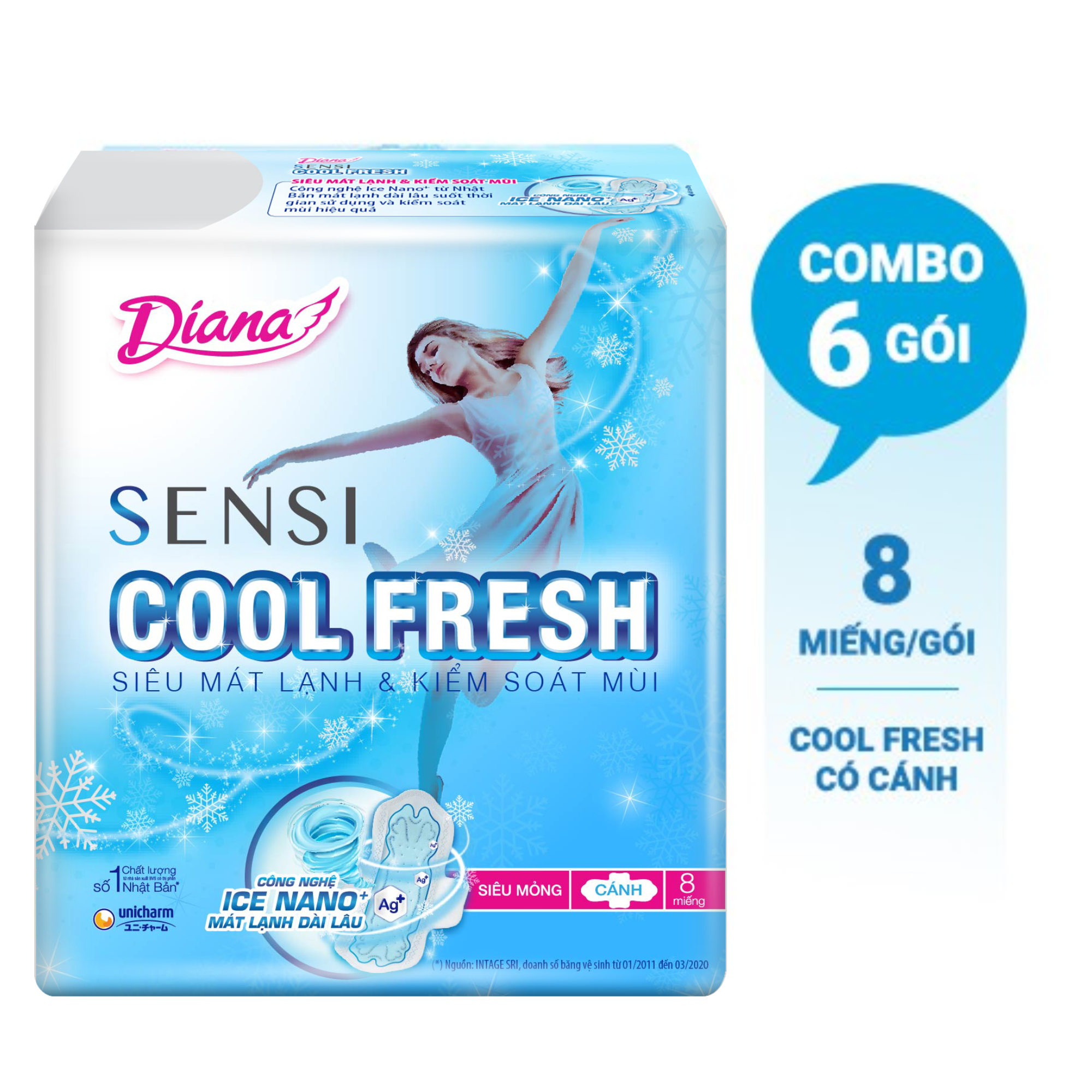 Lốc 6 Gói Băng vệ sinh Diana Sensi Cool Fresh Siêu mỏng cánh 8 miếng - Date luôn mới