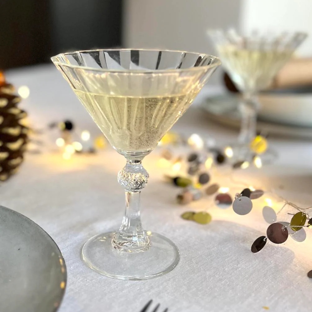 Ly rượu thủy tinh martini 24,5 CL - America 20s có phần chân ly được trang trí bằng các họa tiết như kim cương và phần thân được thiết kế các đường sọc chạy dọc theo bầu ly làm tăng cảm nhận và hưng phấn khi uống các loại rượu martini, cocktail