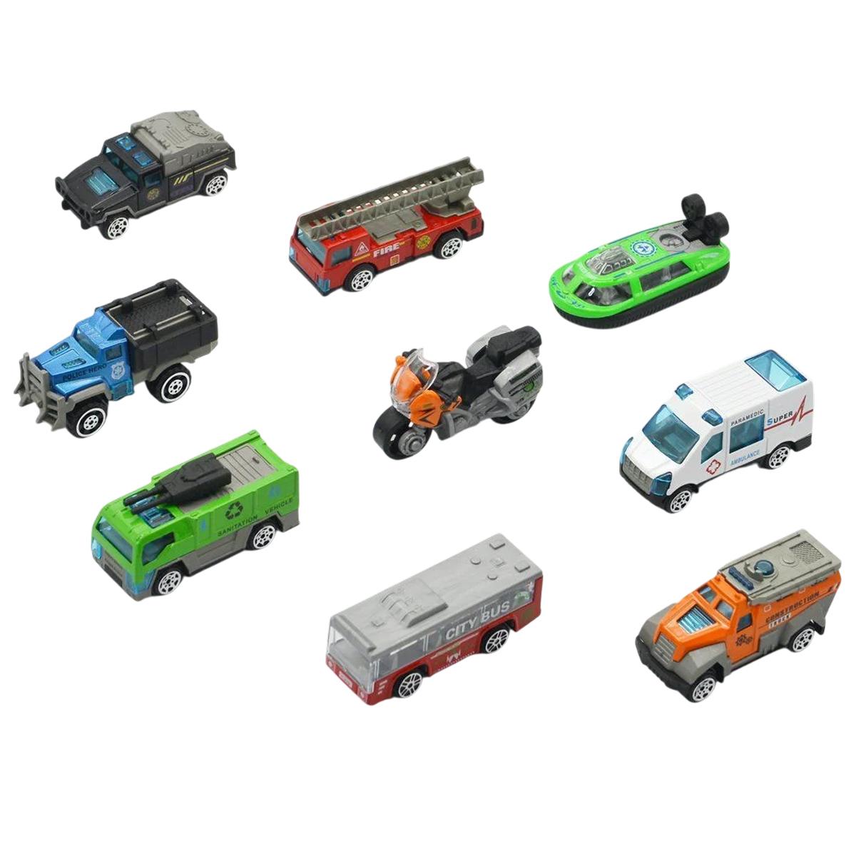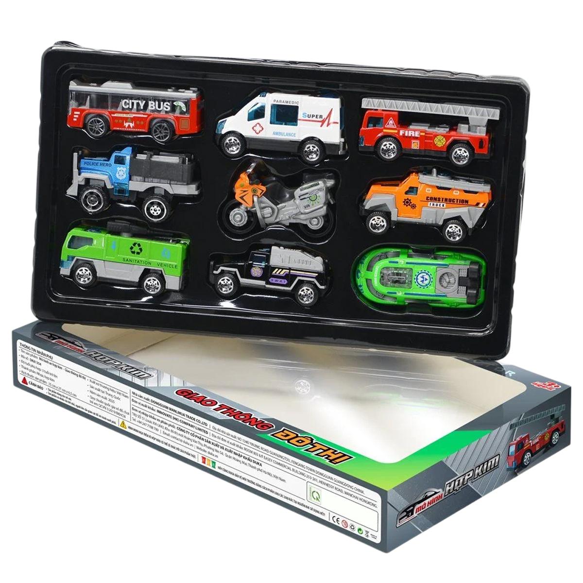Bộ đồ chơi bao gồm 9 xe được thiết kế theo mô hình của những chiếc xe thường xuất hiện trong các đô thị hiện đại như: xe bus, xe cứu thương, xe cứu hộ cứn nạn, xe cảnh sát, xe thu gom rác.. giúp bé nhận biết và làm quen với hình ảnh các phương tiện lưu thông phục vụ cho cuộc sống hàng ngày.