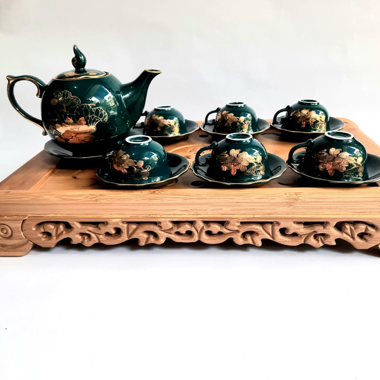 - Bộ sản phẩm không bao gồm khay. Đặc điểm nổi bật: Bộ ấm chén Bát Tràng cao cấp phú quý Mallard màu xanh Arctic họa tiết hoa sen vẽ vàng 24k +100% sản phẩm được khử chì, độc tố ở nhiệt độ là 1350d tiêu chuẩn xuất khẩu đã được đăng ký nhãn hiệu độc quyền, đáp ứng yêu cầu khắt khe nhất kể cả thị trường khó tính như Châu Âu.