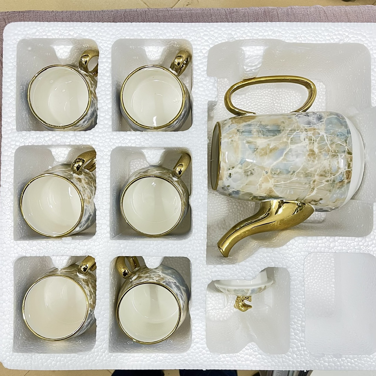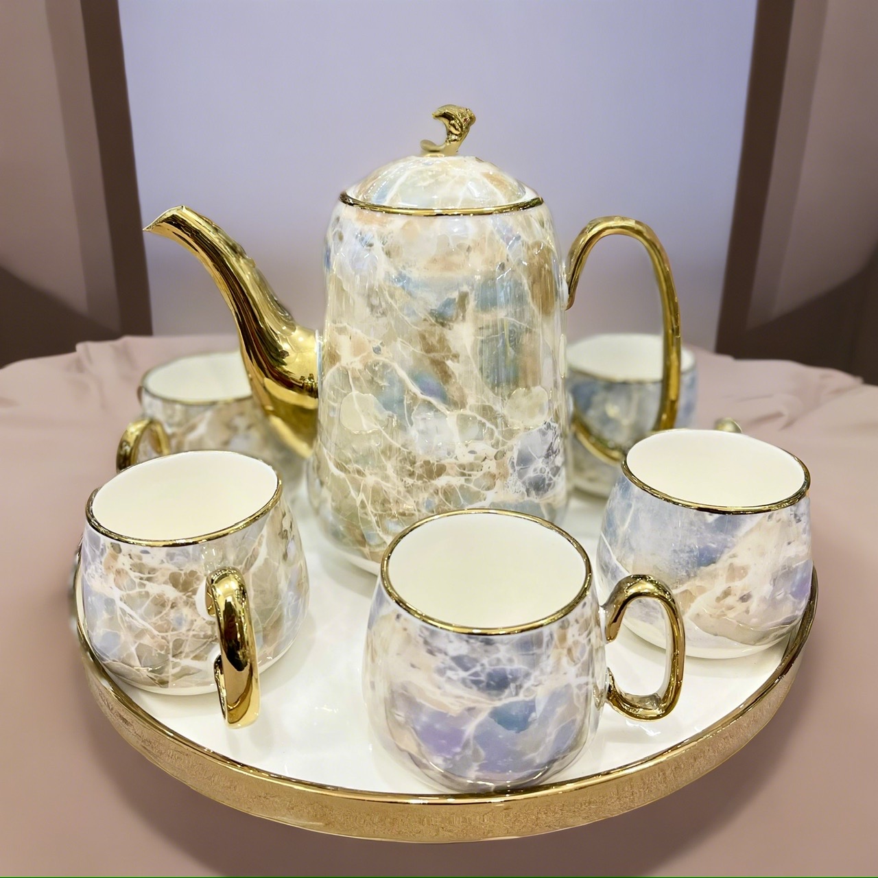 ✨Bộ ấm chén, bình trà cao cấp men vân đá viền mạ vàng 24k đế xoay 360d