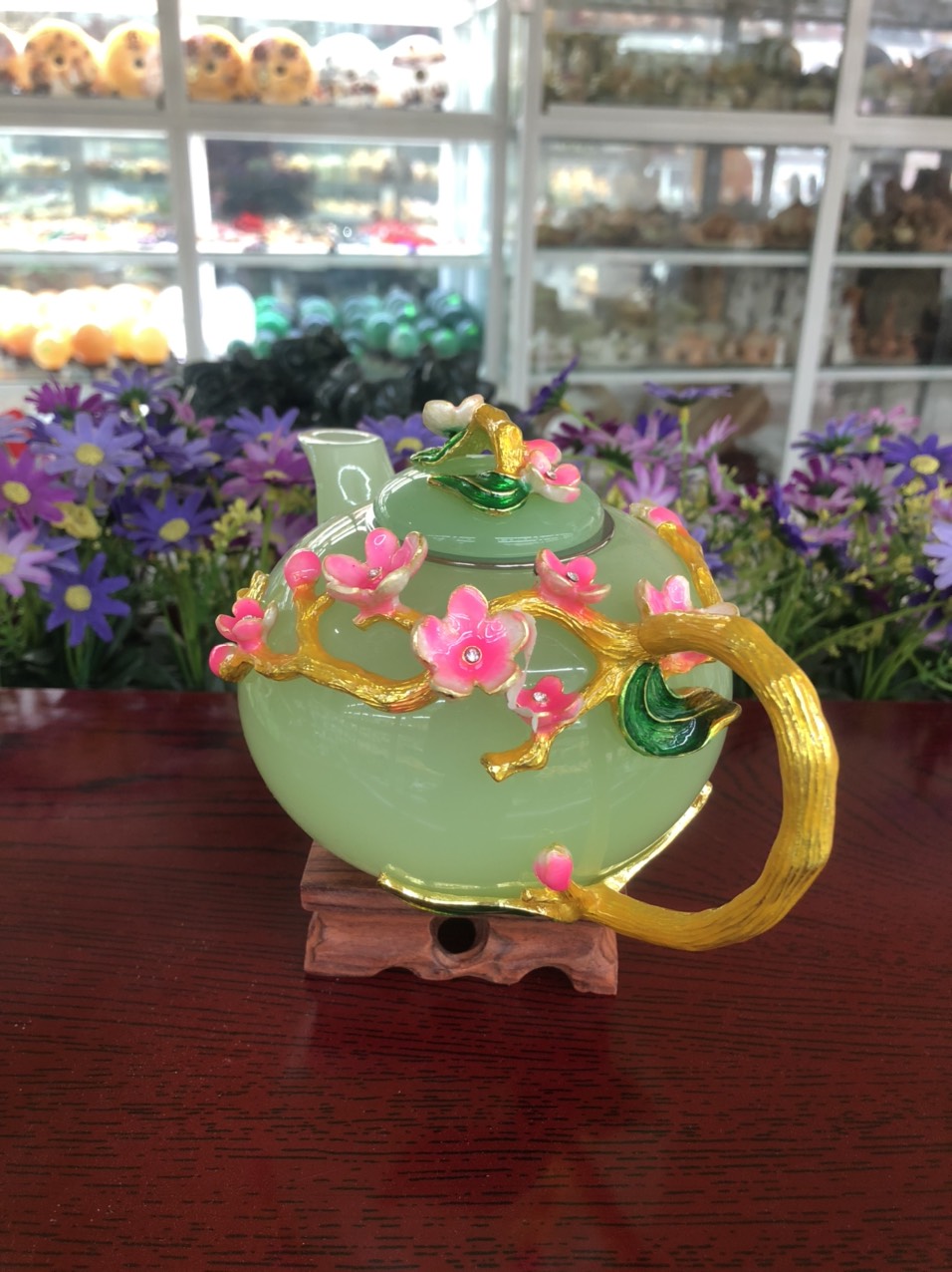 ✨Bộ ấm trà chạm hoa mai đá ngọc cẩm thạch xanh