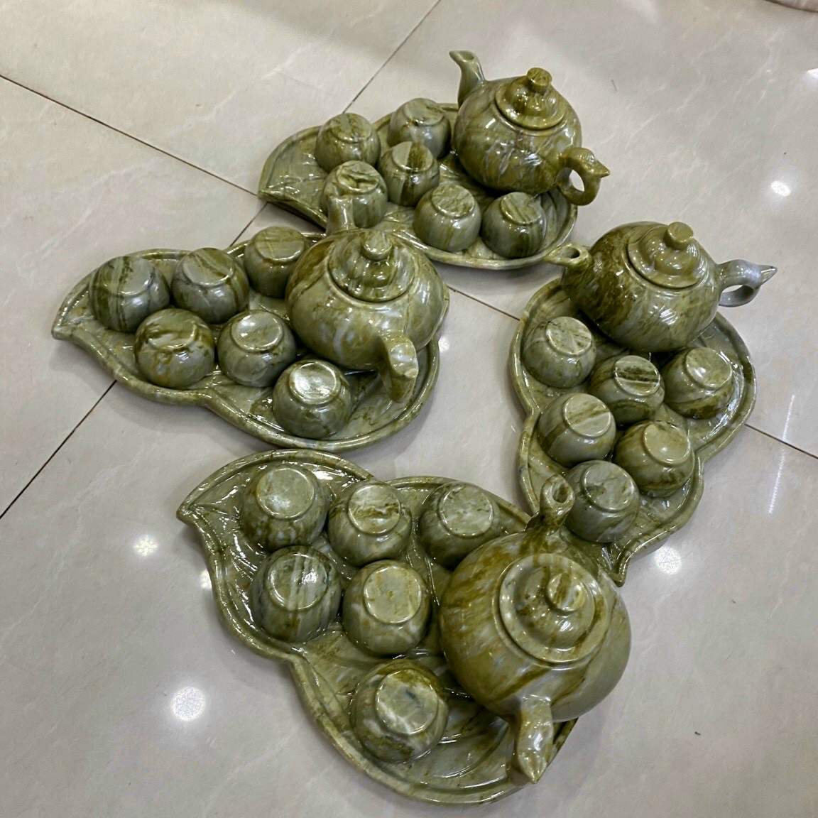 Chất liệu: Đá ngọc Serpentine Bộ sản phẩm gồm: 7 dĩa, 6 ly và 1 ấm trà Dùng để uống trà hoặc làm quà biếu tặ