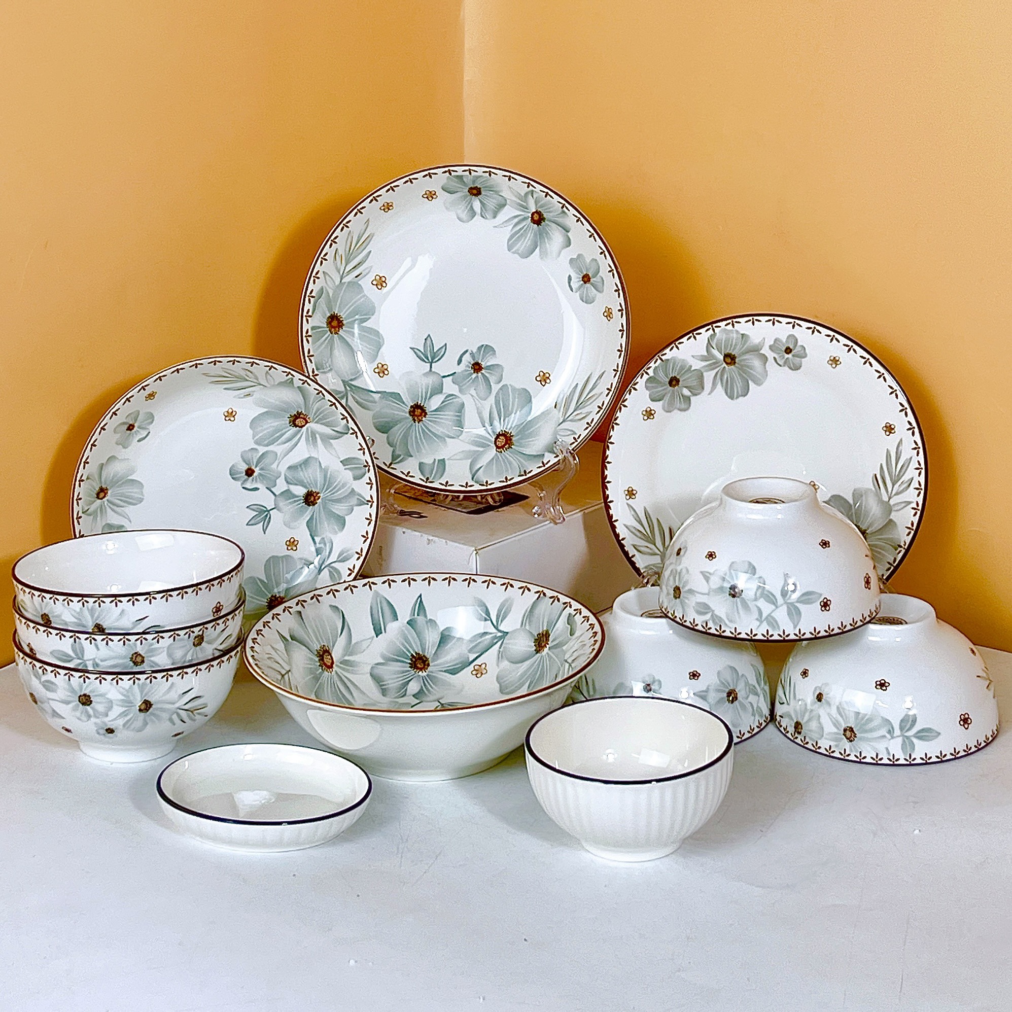 Bộ đồ ăn Bát Tràng - Sản phẩm bao gồm: 6 bát cơm, 1 mắm, 1 muối, 1 tô 16, 1 tô 18, 1 đĩa tròn 14, 1 đĩa tròn 16, 1 đĩa tròn 18,