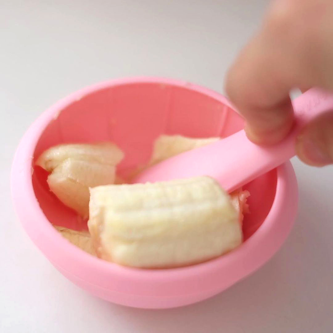 Cán thìa dẹt, chắc chắn cùng với lòng bát có gờ giúp mẹ nghiền thức ăn dễ dàng