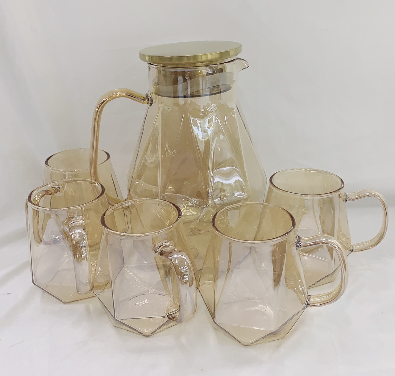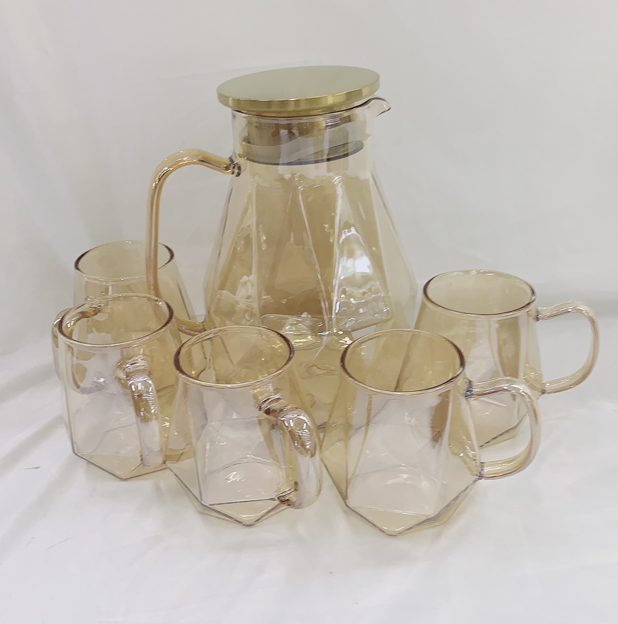 Bộ sp thủy tinh Vân nhân tay cầm màu vàng 1 bình thủy tinh 6 cốc coa tay cầm dễ sử dụng