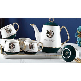 Bộ bình trà cà phê sứ kèm khay màu trắn xanh cổ vịt họa tiết là vàng siêu sang