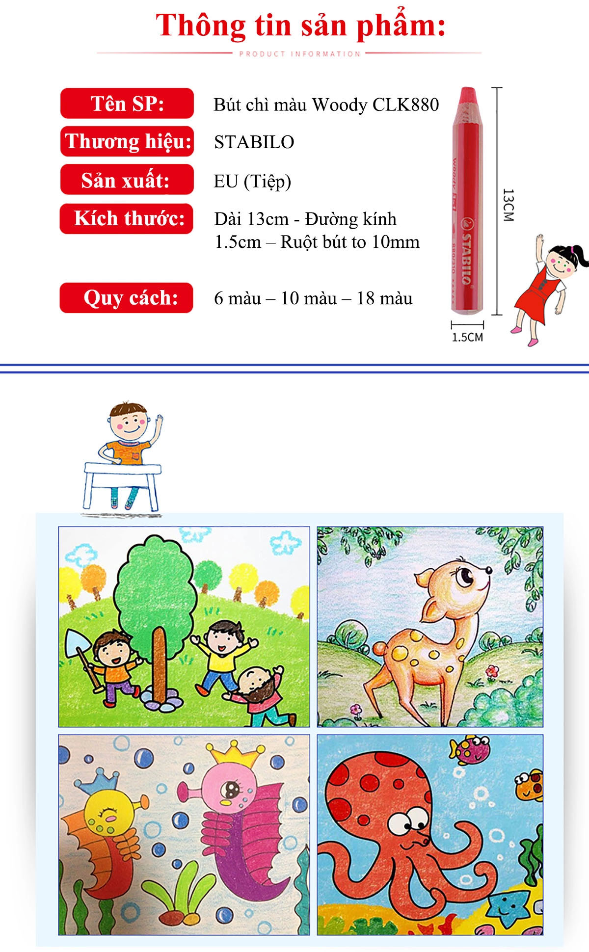 - Chì màu đa năng: chì màu, màu nước, màu sáp - Tô trên nhiều chất liệu: gỗ, cao su, kim loại, cửa kính… - Thân bút to giúp trẻ dễ cầm - Ruột to