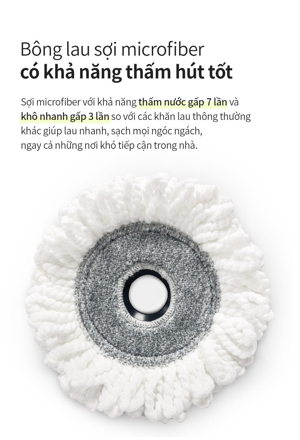 - Bông lau làm bằng sợi vải microfiber thấm hút tốt (khả năng thấm nước gấp 7 lần và khô nhanh gấp 3 lần so với các khăn lau thông thường) , không xơ cứng nên không làm trầy xước bề mặt được lau, giúp lau nhanh, sạch mọi ngóc ngách, ngay cả những nơi khó tiếp cận trong nhà.