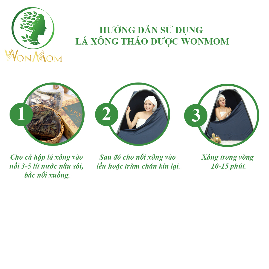 - Giới thiệu: Bộ chăm sóc Wonmom bao gồm 2 sản phẩm: 1 hộp lá xông toàn thân và 1 hộp túi thảo mộc vệ sinh vùng kín cho mẹ. Cam kết 100% nguyên liệu thiên nhiên, an toàn và chất lượng!