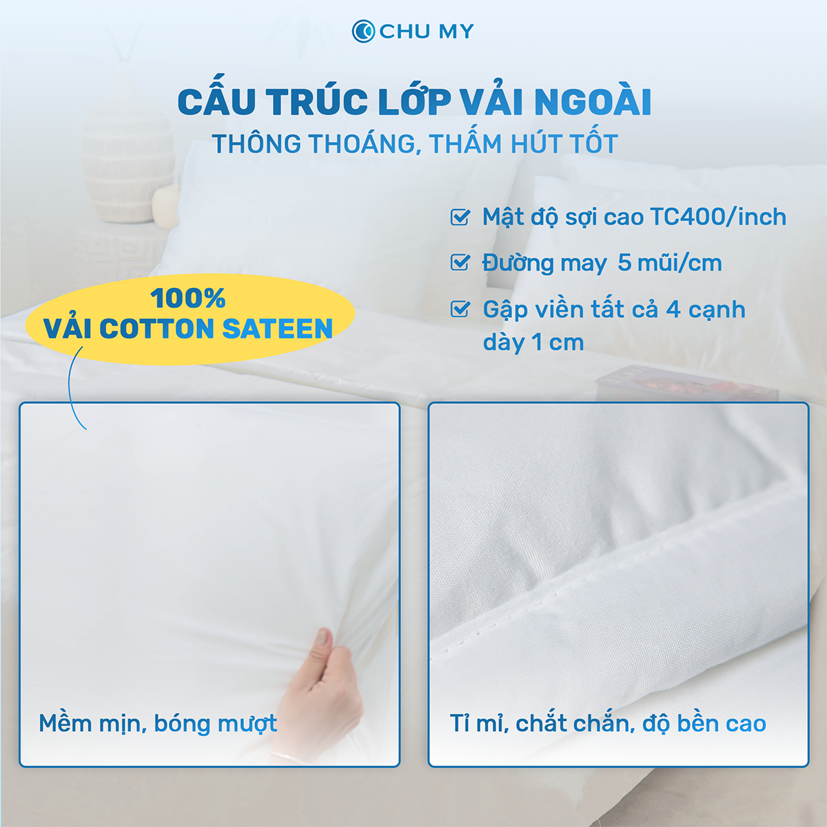 - Cotton Sateen 100% nên thấm hút rất tốt, thông thoáng, rất mát mẻ