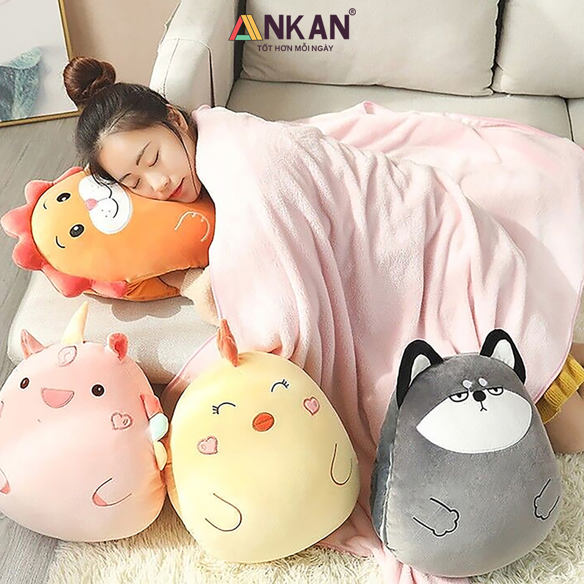Bộ Chăn Gối Văn Phòng Đa Năng Hình Thú Gấu Bông Dễ Thương, Tiện Lợi Cho Bé Đi Học Và Du Lịch CHĂN GỐI VĂN PHÒNG ANKAN CÓ GÌ ĐẶC BIỆT Thiết kế hình thú xinh xắn, phù hợp làm quà sinh nhật, quà tặng bạn bè, người yêu, đồng nghiệp. Đa năng 3 trong 1: vừa là gối ôm – gối tựa lưng – gối luồn tay, kèm chăn êm giữ ấm. Sử dụng tiện lợi cho nhiều mục đích: ngủ trưa văn phòng, đi học, đi làm, du lịch. Trên sản phẩm có nhãn chữ “はい” (hai) – nghĩa là “Vâng” trong tiếng Việt, mang đến cảm giác dễ thương, tích cực và gần gũi theo phong cách Nhật Bản. CAM KẾT TỪ ANKAN Sản phẩm đúng mô tả, đúng mẫu, đúng kích thước. Đổi trả trong 15 ngày nếu khách không hài lòng. Hoàn tiền 100% nếu sản phẩm lỗi do nhà sản xuất. Đóng gói sạch sẽ, an toàn, giao hàng nhanh chóng. THÔNG SỐ KỸ THUẬT Kích thước gối: 40 x 35 cm. Kích thước chăn: 100 x 170 cm (được lồng gọn trong gối). Chất liệu vỏ: vải nhung siêu mềm. Chất liệu ruột: bông PP cao cấp, an toàn cho da. Trọng lượng: khoảng 800g. Có 4 kiểu dáng để bạn lựa chọn là Cáo Đỏ, Cá Voi Xanh, Cừu Trắng và Gấu Nhật Bản ƯU ĐIỂM NỔI BẬT Vải nhung mềm mịn, thoáng khí, dễ giặt sạch.