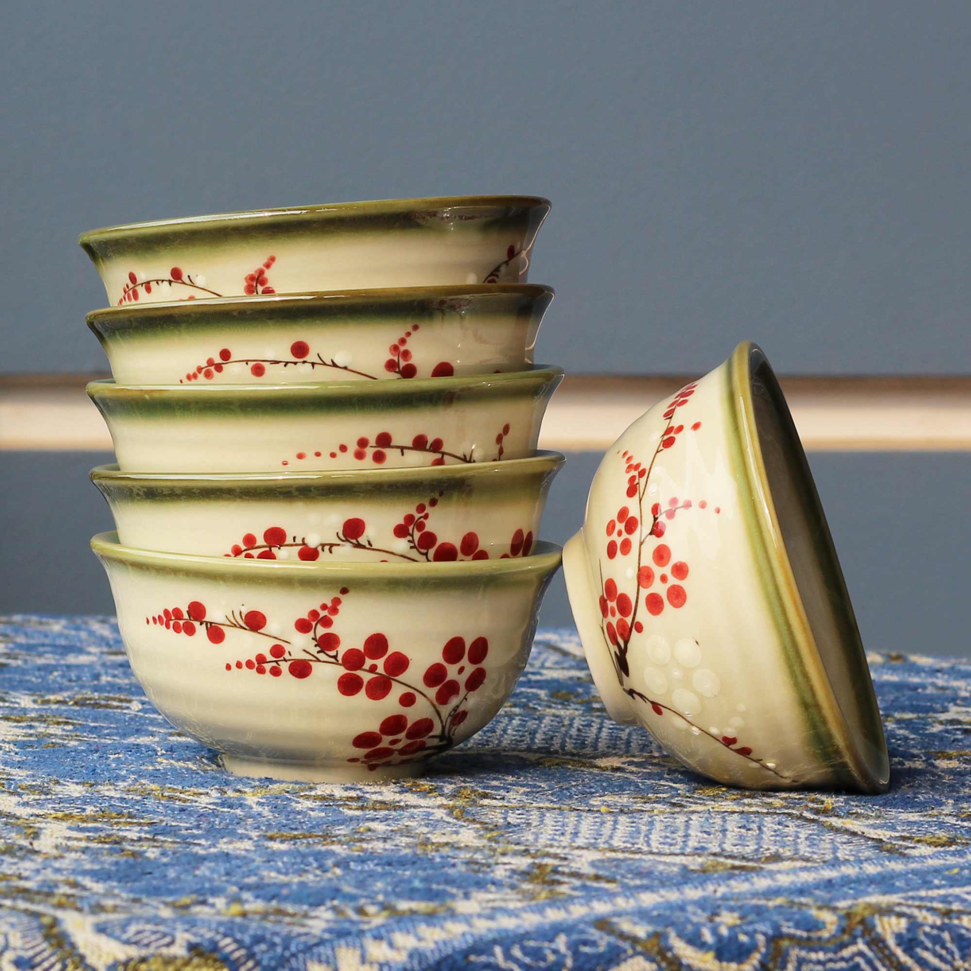 Bộ sáu chiếc Bát Pomona 5,5 inch/14cm này có hoa văn hình minh họa thực vật đẹp mắt. Mỗi bát trưng bày một họa tiết trái cây khác nhau: Táo, Cherry, Blackberry, Lê, Mơ và