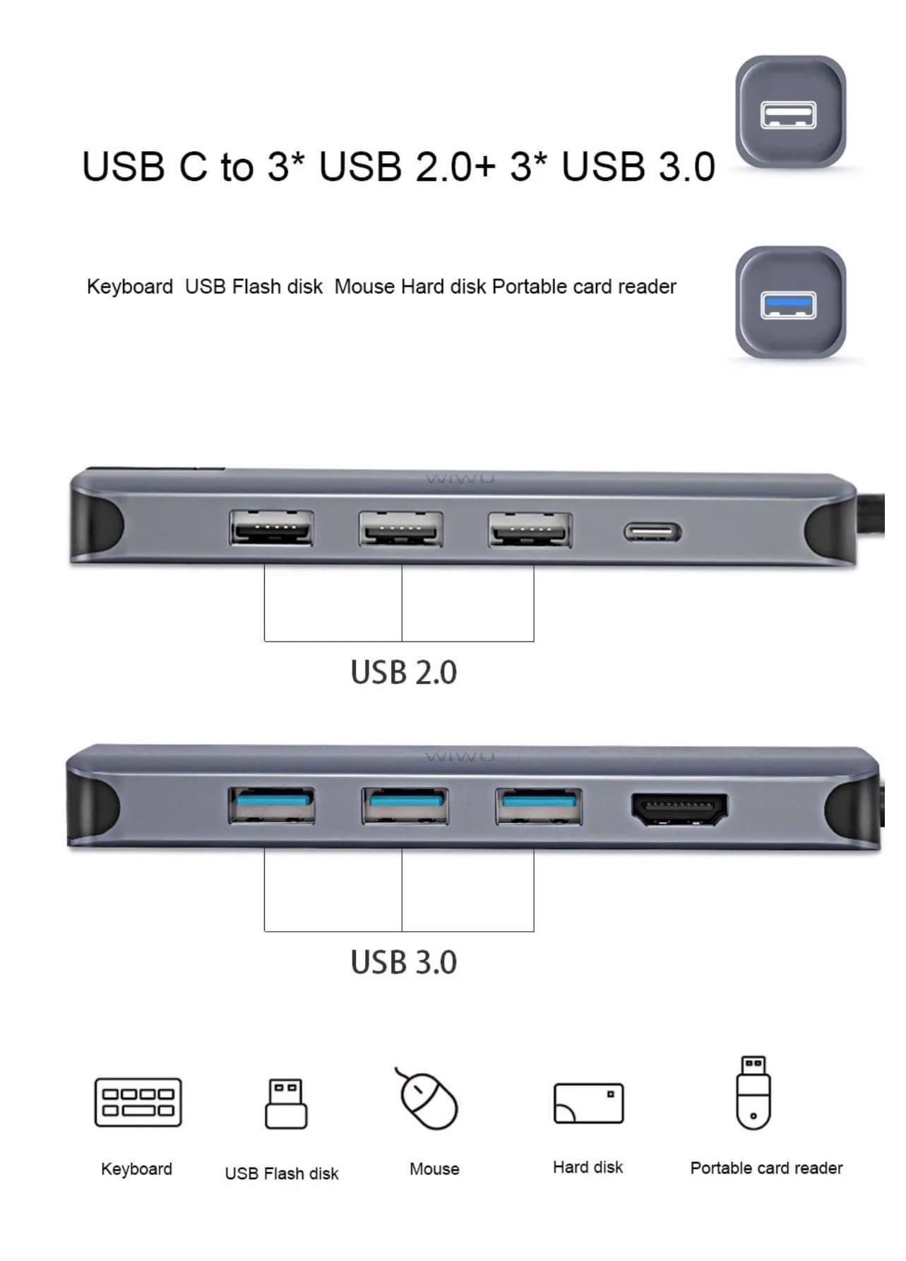 Hub #Wiwu Alpha 7 in 1 USB - C Hub #A731HC 3*USB3.0+ SD+TF+4K HDMI+100W PD Thương hiệu: #Wiwu Chất liệu: Hợp kim nhôm Thông số kỹ thuật: 3 cổng USB 3.0+1, 1 cổng TF, 1 cổng HDMI, PD, 1 cổng SD Đầu ra HDMI 4K: phản chiếu hoặc mở rộng màn hình của bạn với cổng HDMI của bộ chuyển đổi USB C và truyền trực tiếp video 4K UHD hoặc full HD 1080P tới HDTV, màn hình hoặc máy chiếu cho bữa tiệc hình ảnh như rạp chiếu phim. Hỗ trợ sạc PD: Ba cổng USB hỗ trợ tốc độ truyền tải, kết nối với #điện thoại thông minh, #máy tính bảng và #ổ cứng của bạn để truyền dữ liệu dễ dàng.