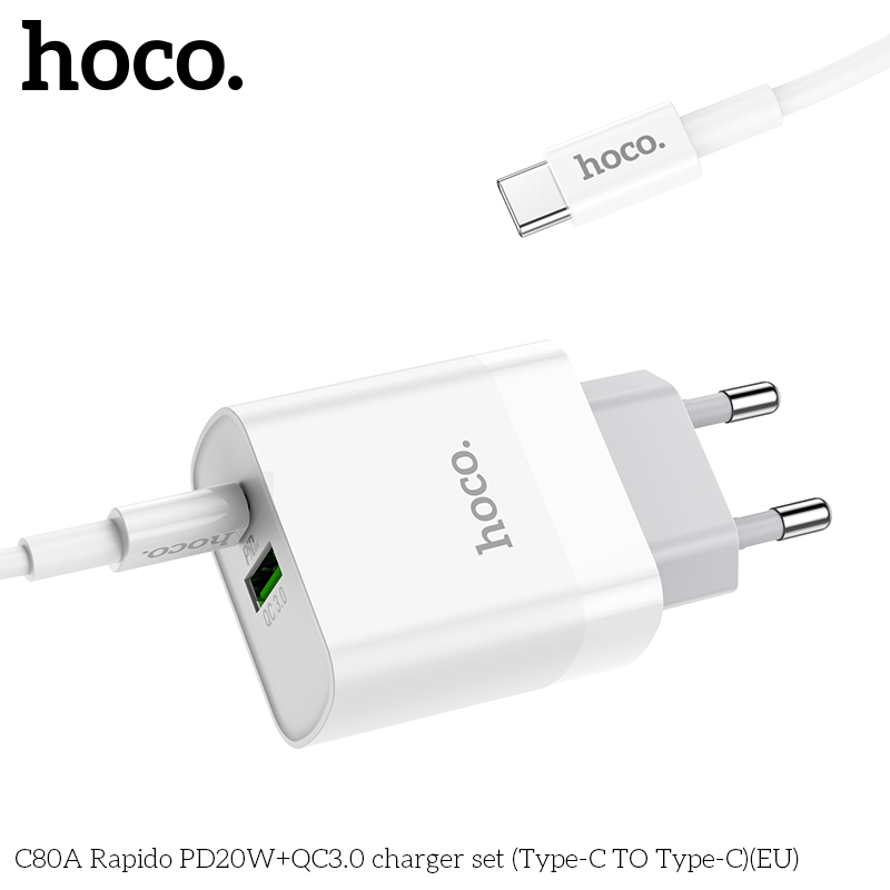 Bộ Cốc sạc 2 cổng USB và PD kèm Cáp sạc Type-C to Type-C Hoco C80A QC3.0 và PD20W (Trắng) - Hãng phân phối chính thức Thông tin sản phẩm: Bộ sạc tường C80A Rapido