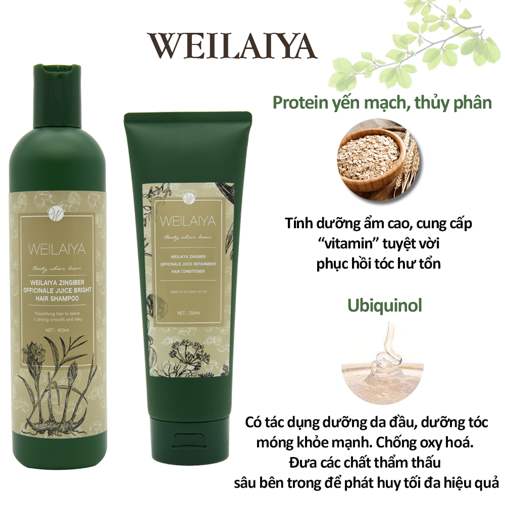 Một loại dầu gội tốt thực sự, loại dầu gội và xả lấy sức khoẻ da đầu làm tiêu chuẩn số 1, với thành phần từ thiên nhiên sẽ giúp bạn! Bộ dầu gội hỗ trợ trị rụng tóc Hà thủ ô Weilaiya có nguồn gốc tự nhiên, không hoá chất kích thích mọc tóc mà nó hoạt động bằng cách kích thích da đầu, làm tăng cường lượng máu lưu thông đến chân tóc giúp cho tóc mọc nhanh và dày hơn. Khi gội cảm thấy da đầu nóng ấm bởi tinh chất gừng thúc đẩy thông huyết lên não, sạch gầu, giảm rụng tóc, ngứa da đầu. Gừng và dầu trà sẽ làm sạch dầu trên tóc, một phần nguyên nhân gây ngứa tóc rụng tóc và hôi tóc.