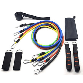 Bộ dây đàn hồi tập thể lực có 5 dây, mỗi dây có mức trọng lượng khác nhau, từ nhẹ tới nặng (8 lbs, 15 lbs, 20 lbs, 25 lbs, 30 lbs) có thể