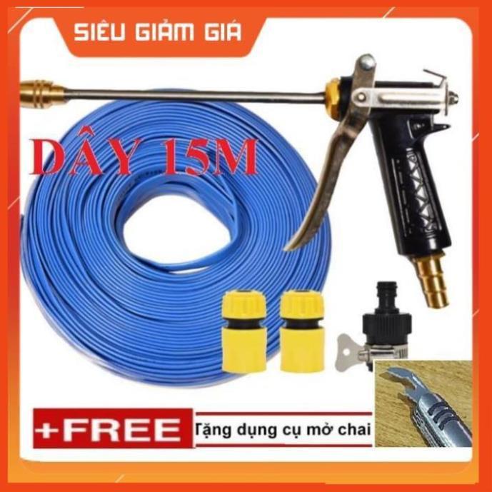 ✨Bộ dây vòi xịt nước rửa xe, tưới cây . tăng áp 3 lần, loại 15m 206318 đầu đồng,cút,nối đen+ tặng mở chai