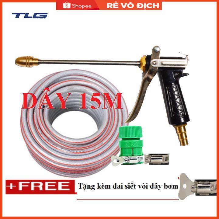 ✨Bộ dây vòi xịt nước rửa xe, tưới cây . tăng áp 3 lần, loại 15m 206318 đầu đồng,đai,nối vàng+ tặng đai