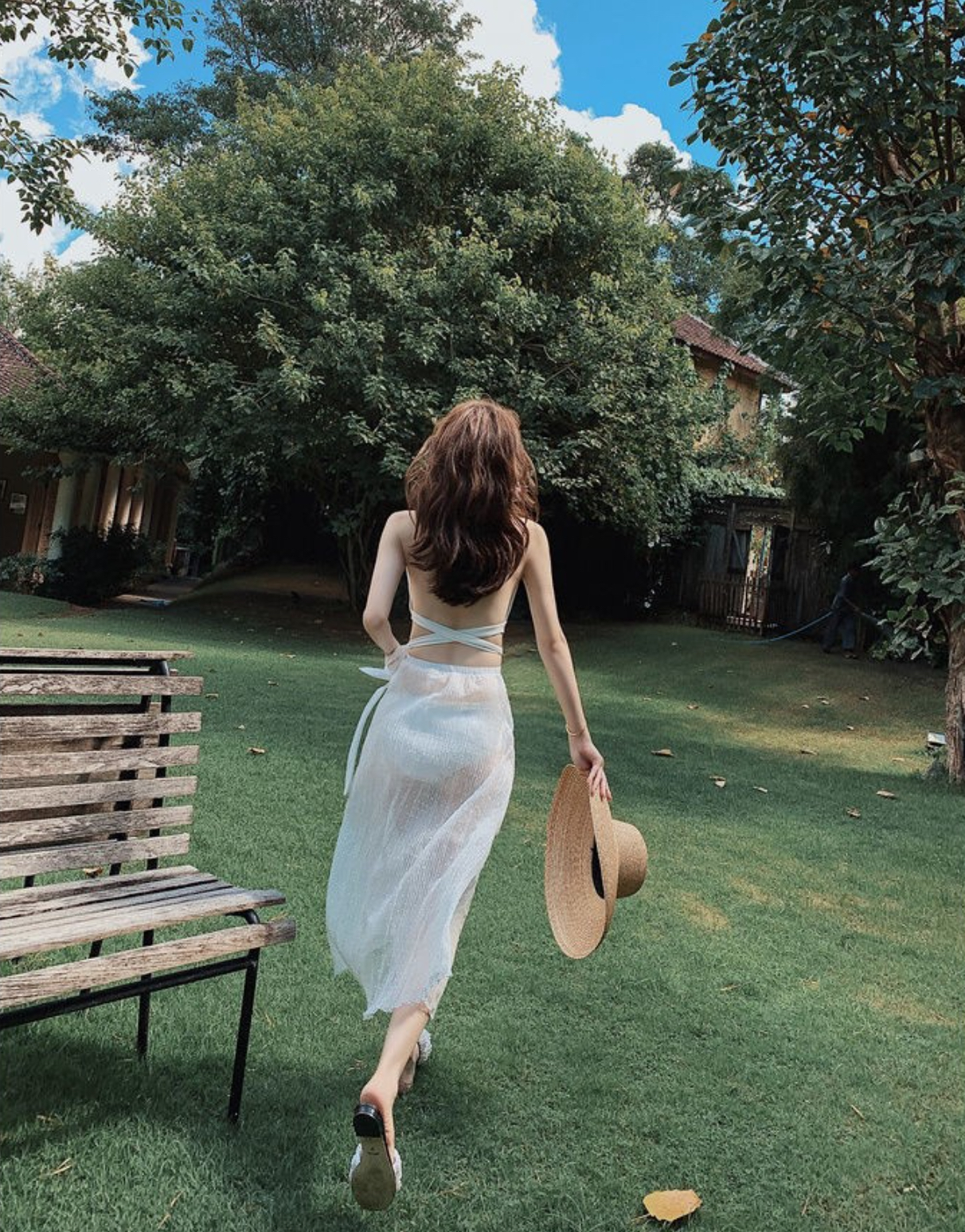 - Chất vải nhung tuyết mềm, co giãn tốt, mặc vừa ôm sát mà vẫn tạo sự mềm mại. - Đồ bơi trắng nhưng nhờ dáng váy chữ A xoè nên mặc sẽ cực kì