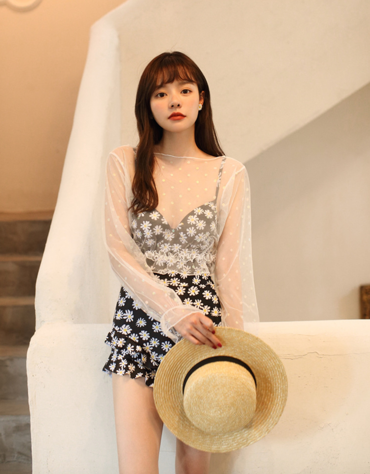 ✨Bộ đồ bơi bikini nữ 1 mảnh đi tắm biển hoa cúc kèm áo croptop ren trắng chấm bi tiểu thư hot trend 2021- B02