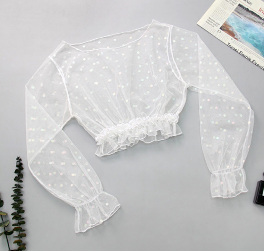 - Set gồm: áo ren trắng chấm bi khoác ngoài kèm bộ liền thân