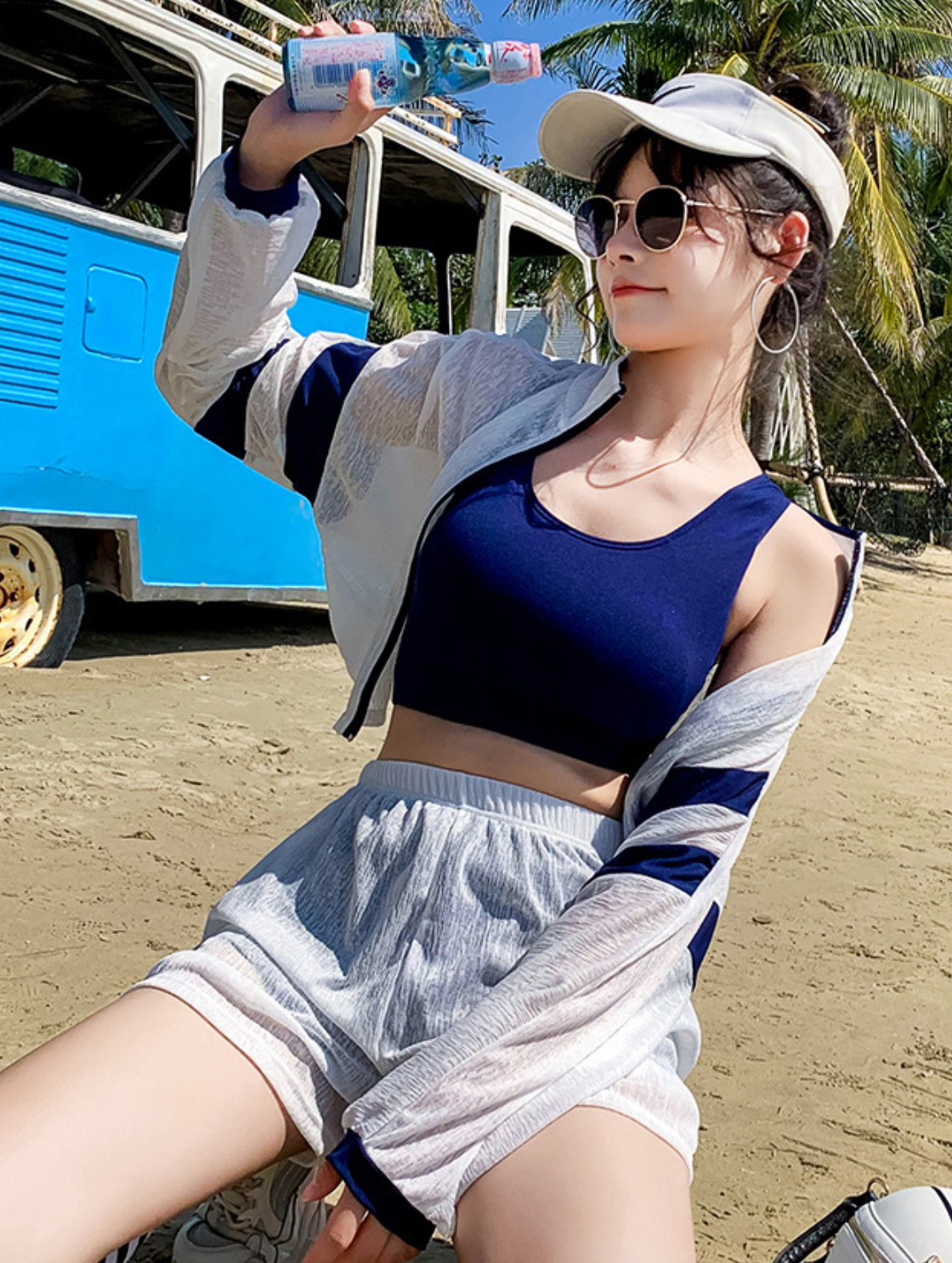 - Set gồm: quần short thun, áo croptop thun, áo khoác voan trắng be kéo khoá khoác ngoài, quần voan trắng be