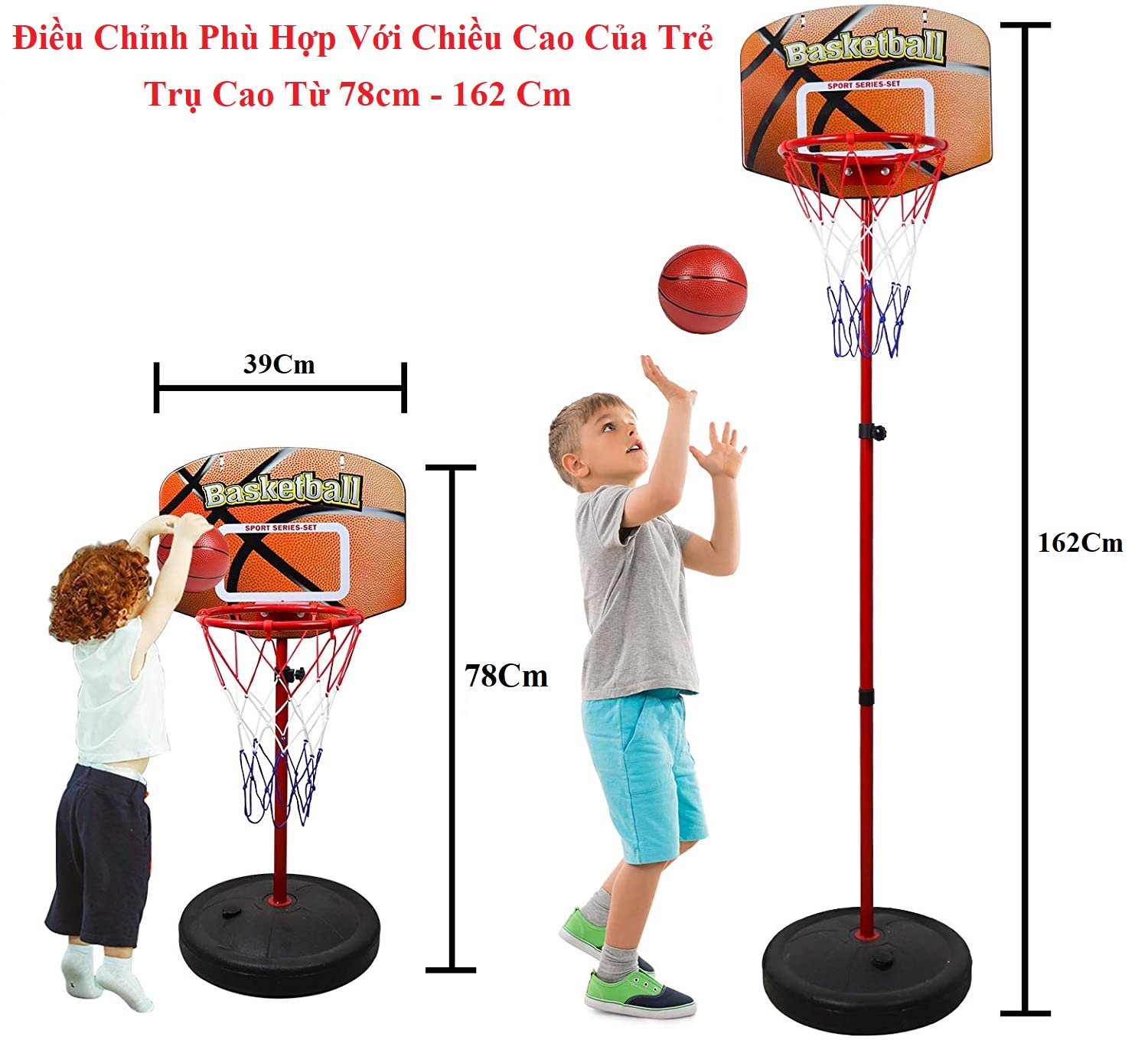 Chiều cao của Bộ đồ chơi Bóng rổ cho bé có thể được điều chỉnh tối đa lên tới 1,6m. Phù hợp cho tất cả các bé từ 1 – 10 tuổi.
