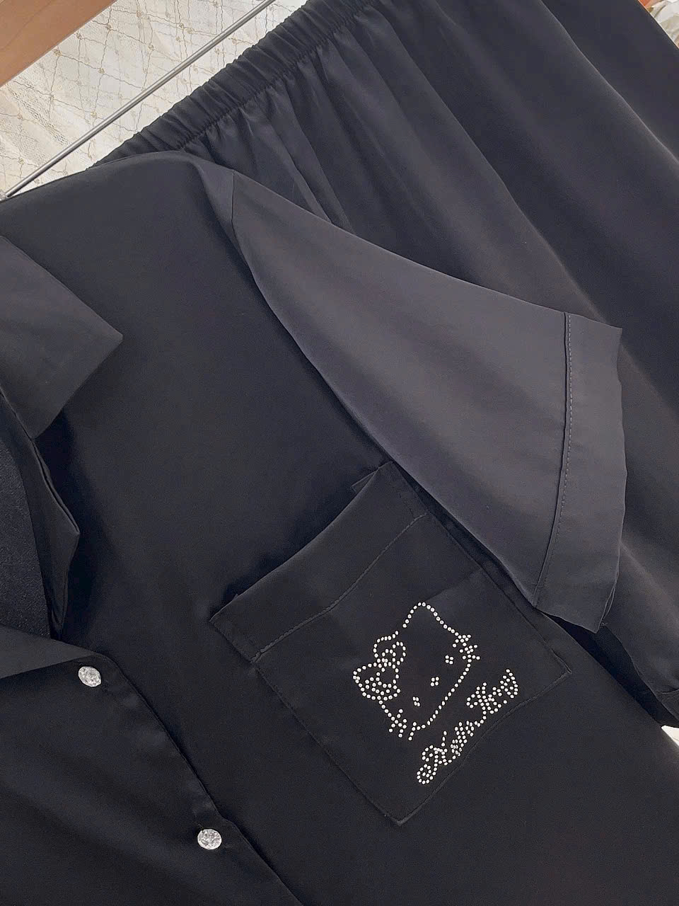 Thương hiệu: Sanny House Tên sản phẩm: Bộ Đồ Ngủ Chất liệu: lụa cao cấp mềm mịn, co giãn, thấm hút tốt Kiểu dáng: dễ thương, trẻ trung, hiện đại Màu: đen Size: dưới 60kg