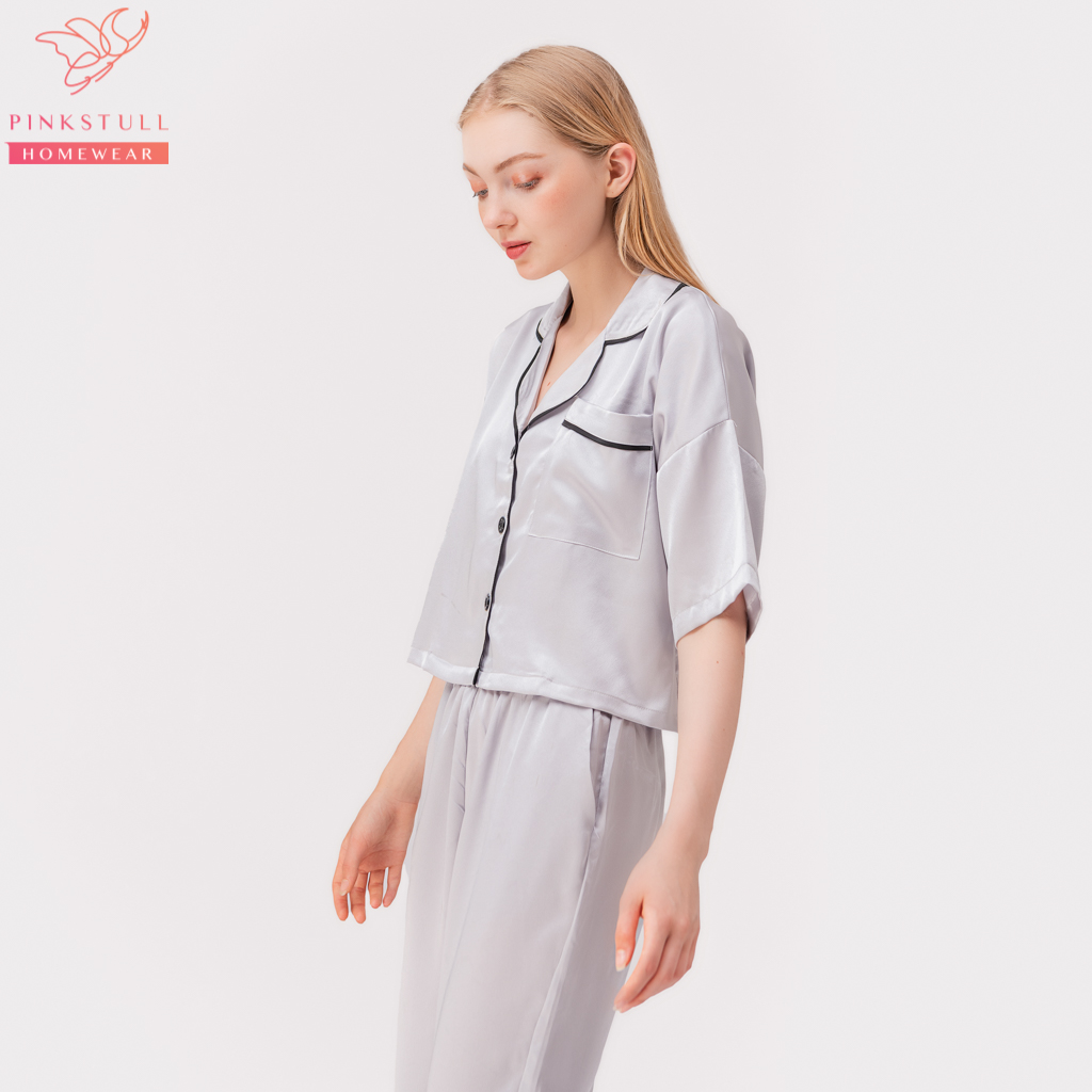 ✨Bộ đồ ngủ pijamas tay ngắn quần dài Pink Stull 3 Màu:xám viền đen,đỏ viền trắng,hồng viền đen