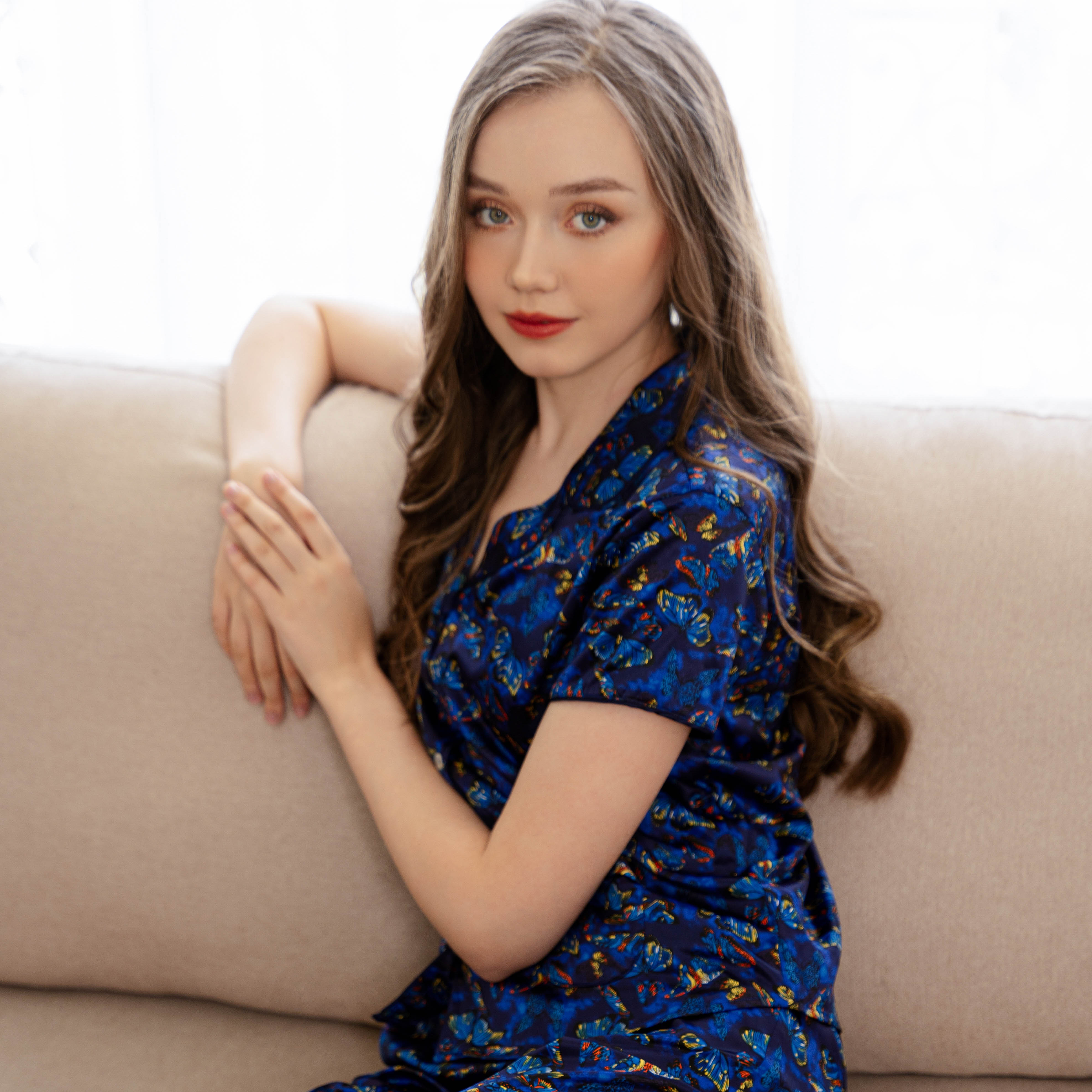 Pyjama mặc nhà màu nâu họa tiết chấm bi xanh - LA MỘC chất liệu vải SATIN LỤA. Thiết kế chú trọng từng đường may. Mang lại cảm giác thoải mái cho người mặc. Mang