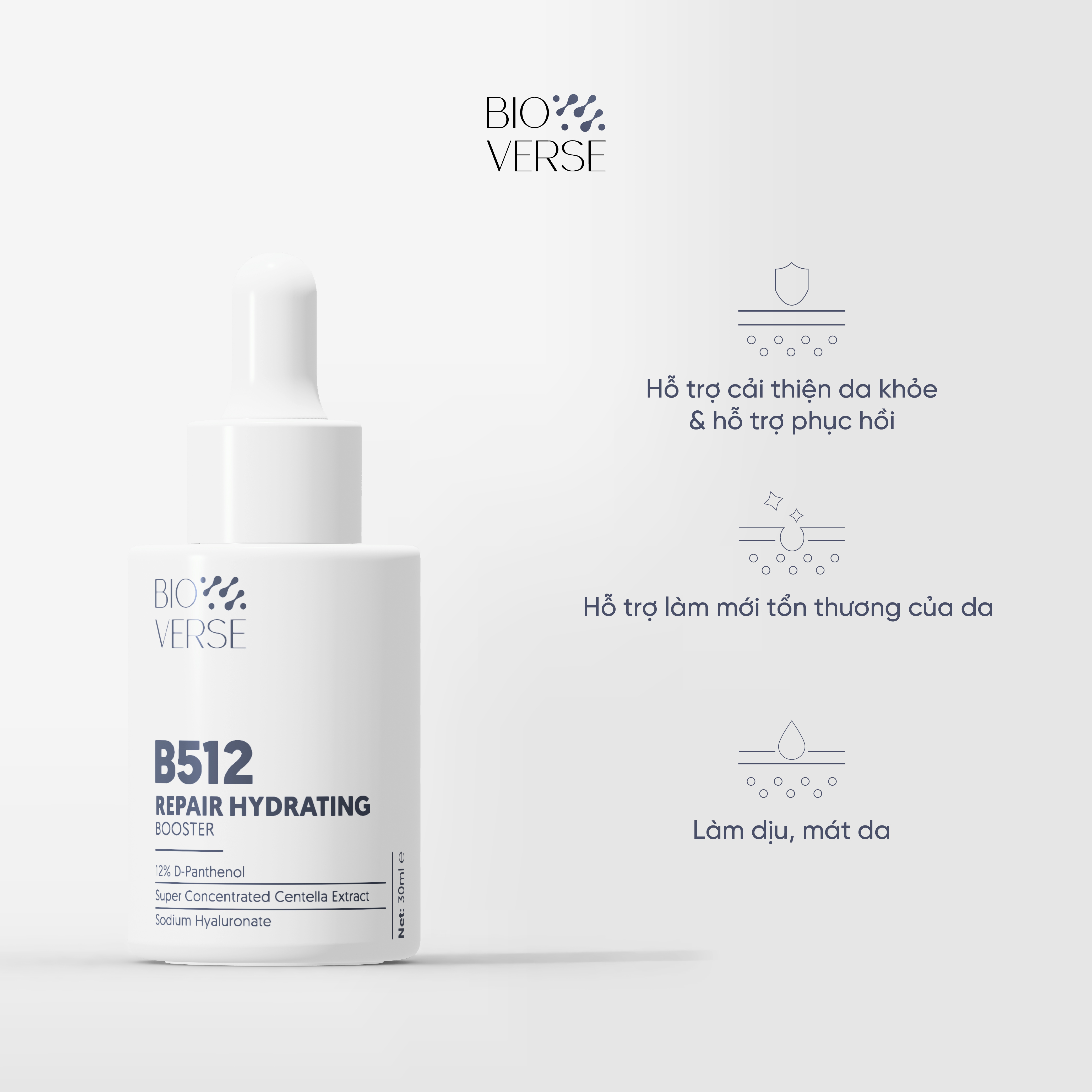 - Tinh chất B512 Superdrop Hydrating Booster là sản phẩm hỗ trợ phục hồi chuyên sâu dành cho da có nhiều khuyết điểm giúp cải thiện nền da và kết cấu tổng thề. Chứa lên đến 12% Vitamin B5 để tăng tốc hỗ trợ làm mới những tổn thương của da, kết hợp với chiết xuất rau má làm dịu và hỗ trợ giảm cảm giác ngứa rát, mẫn đỏ. Đồng thời bổ sung thêm Hyaluronic Acid để cải thiện độ ẩm và củng cố hàng rào giúp bảo vệ tự nhiên của da.