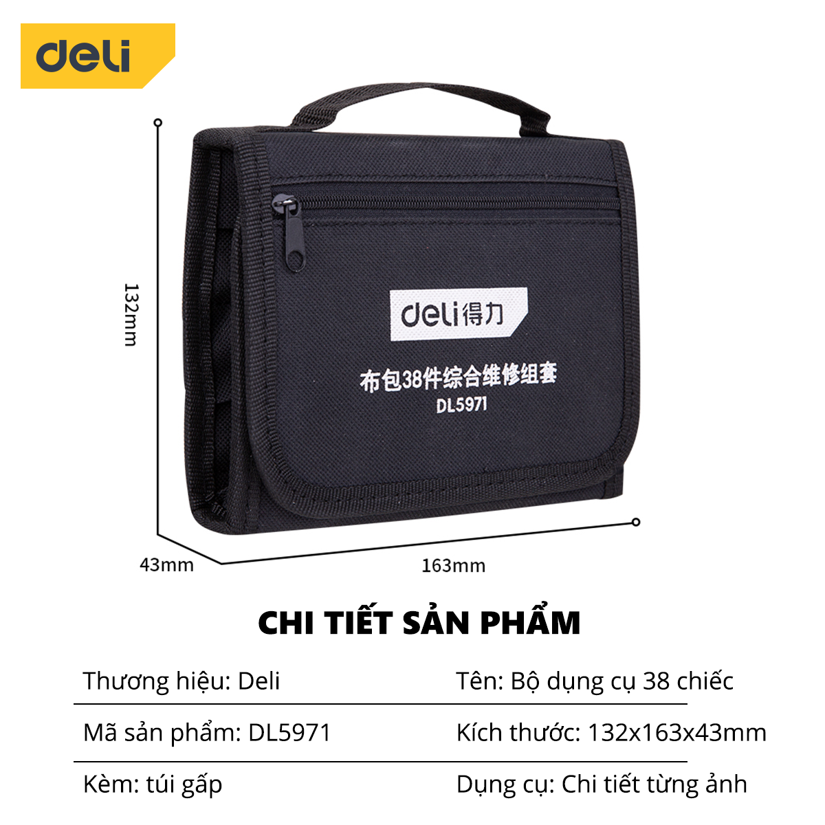 ✨Bộ Dụng Cụ Sửa Chữa Deli 38 Chi Tiết Cao Cấp - Sử Dụng Nhiều Mục Đích - Túi Vải Tiện Lợi, Dễ Dàng Mang Theo - DL5971