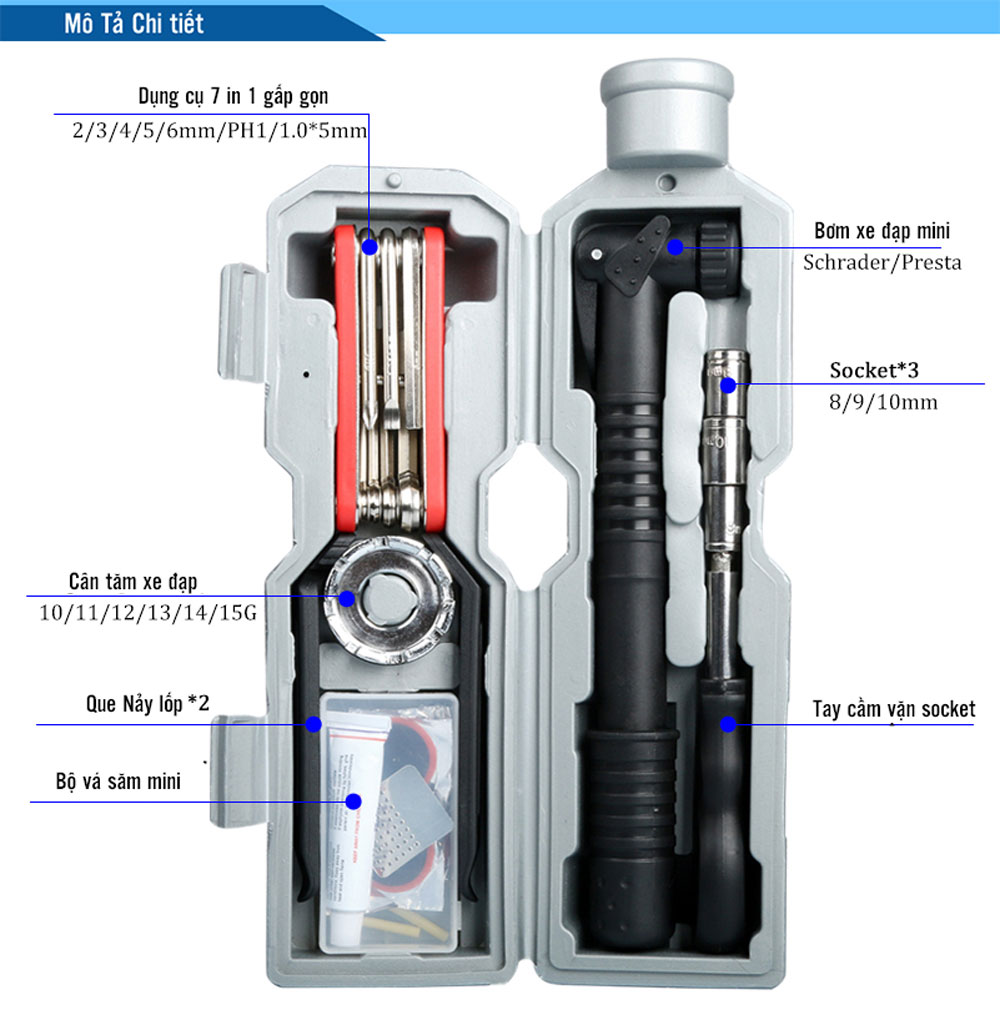 Bộ Dụng Cụ Sửa Chữa Xe Đạp Di Động Bơm Lốp Đa Năng Mini Và Vá Săm Xe Đạp Gắn Sườn Xe (Dạng Bình Nước) MaiLee Bộ dụng cụ sửa chữa này được thiết kế theo hình dáng của bình nước xe đạp (không phải là Bình nước) và với một Giá đỡ Bình nước đi kèm Bộ sản phẩm có thể được gắn trên khung sườn xe đạp, chiếm ít không gian, dễ dàng mang theo và chứa nhiều loại công cụ phổ biến cho việc xử lý các trường hợp khẩn cấp trong quá trình di chuyển/ đạp xe. Trọng lượng: 694g Kích thước: 28x7.4cm Thích hợp cho tất cả các loại người thích chơi xe đạp, xe máy, v. v. Tuyệt vời cho công việc sửa chữa của lốp xe, phanh, đèn & dây xích. Tiện lợi khi được đi kèm với Giá đỡ bình nước, giúp bảo quản, sử dụng tiện lợi hơn khi cần Đây là bộ dụng cụ mini sửa chữa, nếu bạn cần bộ sửa chữa chuyên nghiệp hơn có thể tìm kiếm các sản phẩm chuyên dụng khác cho phù hợp mục đích của mình Tính năng: Thiết kế với hình dạng bình nước xe đạp kiểu dáng thời trang, phù hợp tính di động/ di chuyển xe đạp thường xuyên Chiếm ít không gian của xe đạp Quy cách: Chất liệu: Nhựa + Kim loại Kích thước đóng gói: 321010cm Trọng lượng gói hàng: 694G Danh Sách gói hàng: 1x Dụng cụ gấp gọn 7 trong 1 1 x Tay cầm socket 2 x Nảy lốp xe đạp bằng nhựa 1 x bộ dụng cụ vá săm xe đạp 1 x Bơm mini xe đạp 1 x Lục giác âm 8/9/10mm 1 x Giá đỡ bình nước