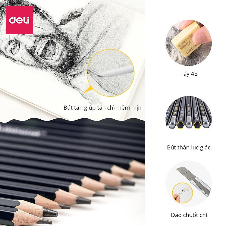 16 cây bút chì gồm: 2H,HB,B,3B,5B,6B,8B,9B,10B,12B và 3 cây 2B, 3 cây 4B