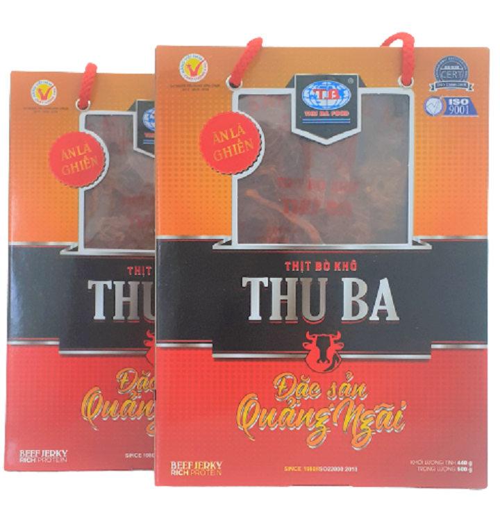 BÒ KHÔ THU BA là món đặc sản Quảng Ngãi, đạt tiêu chuẩn ISO 9001:2015 và là Hàng Việt Nam Chất Lượng Cao do Người tiêu dùng bình chọn 2017, 2018, 2019 và 2020
